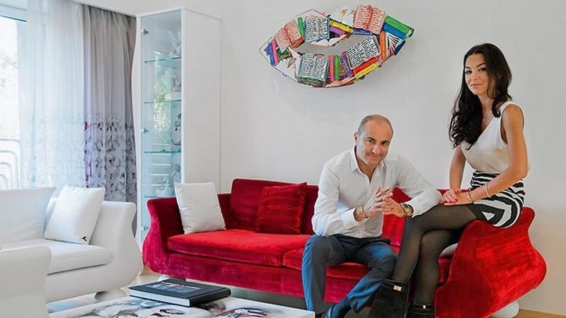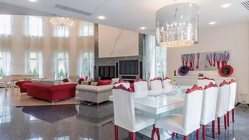 Второй этаж дома представляет собой частную зону. Здесь, прямо над основной гостиной, расположена ещё одна зона отдыха, где преобладает мебель белого и красного цветов. Особое внимание привлекает журнальный столик с изображением Мэрилин Монро.