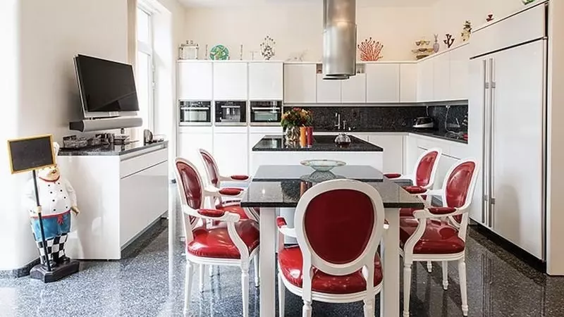 Дальше находится кухня, оформленная в минималистичном стиле. В её центре расположен кухонный остров с чёрной каменной столешницей. Этот же материал использован для рабочей поверхности и фартука. Фасады гарнитура выполнены в белом цвете и открываются лёгким нажатием, что подчёркивает лаконичность дизайна.