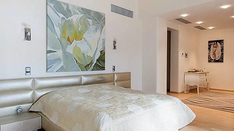 Неподалёку расположена хозяйская спальня. В отличие от других помещений, её интерьер максимально сдержан и спокоен. В оформлении преобладают пастельные и белые тона, без ярких деталей. Единственным украшением являются картины, развешанные на стенах, что создаёт атмосферу уюта и умиротворения.