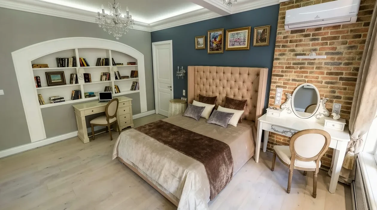 В отличие от многих звёздных квартир, здесь нет демонстративной роскоши. Интерьер выполнен в мягкой, почти «домашней» стилистике с элементами прованса: светлые оттенки, текстиль, декоративные детали. Отдельного внимания заслуживает спальня, разделенная на функциональные зоны. В ней предусмотрены: индивидуально изготовленная кровать с системой хранения, гардеробная ниша, встроенная библиотека, декоративная отделка под кирпич. Такой подход характерен для квартир с ограниченной площадью комнат: за счет зонирования создаётся ощущение большего пространства.