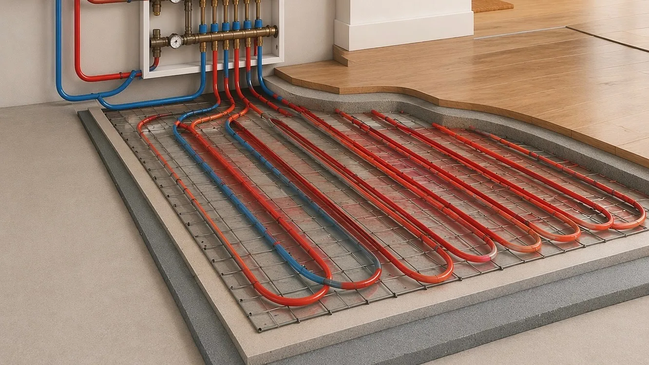 Водяной тёплый пол — инженерная система, а не просто труба в полу. Чтобы она работала, нужны утеплитель, сама труба, крепёжные элементы, демпферная лента, коллекторная группа, насосно-смесительный узел, автоматика и стяжка. Опрессовка и пусконаладка нередко идут отдельной строкой.