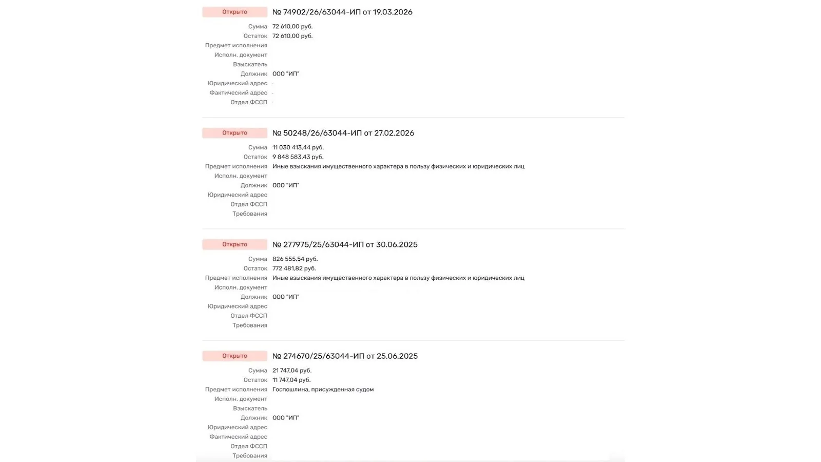 - исполнительные производства на десятки миллионов рублей.