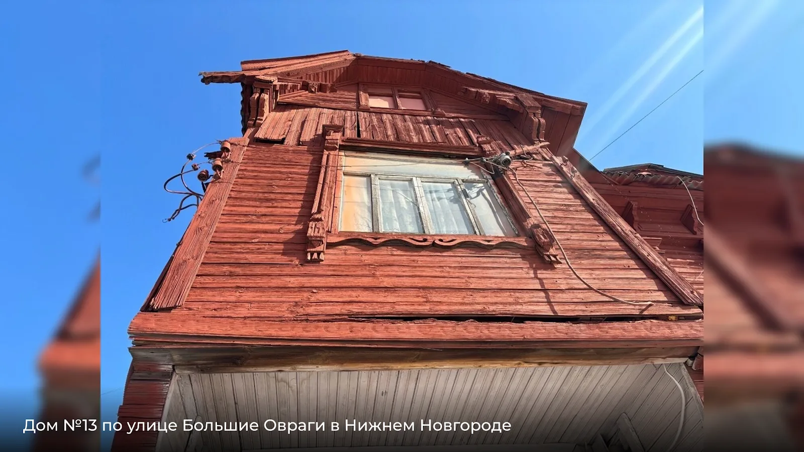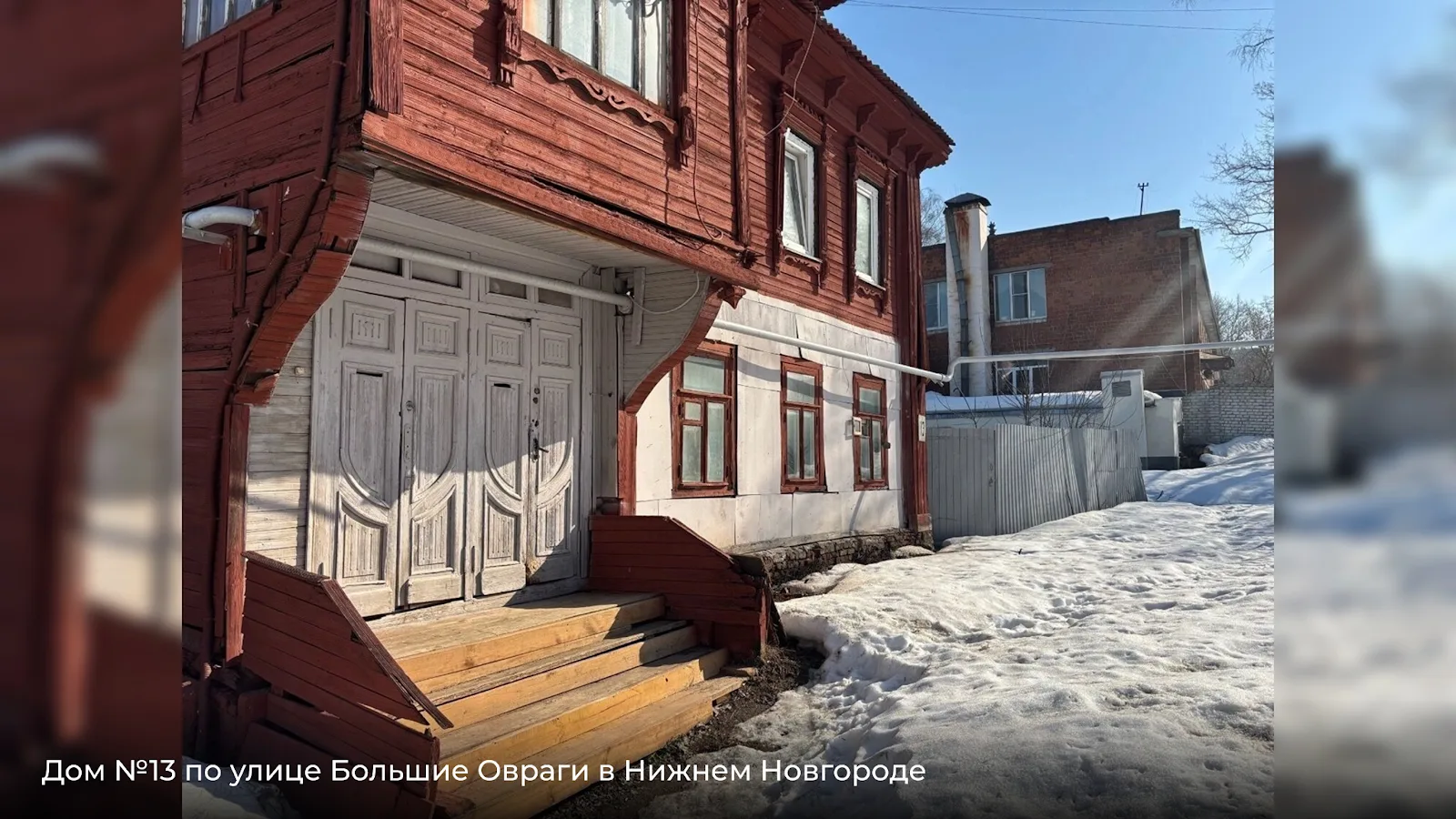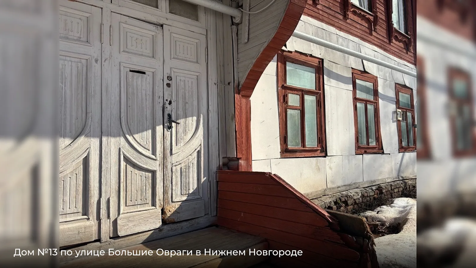 Дом №13 — деревянный, с подкрашенным, но изношенным фасадом. Щели в обшивке, деформированные доски — признаки длительного отсутствия капитального ремонта.