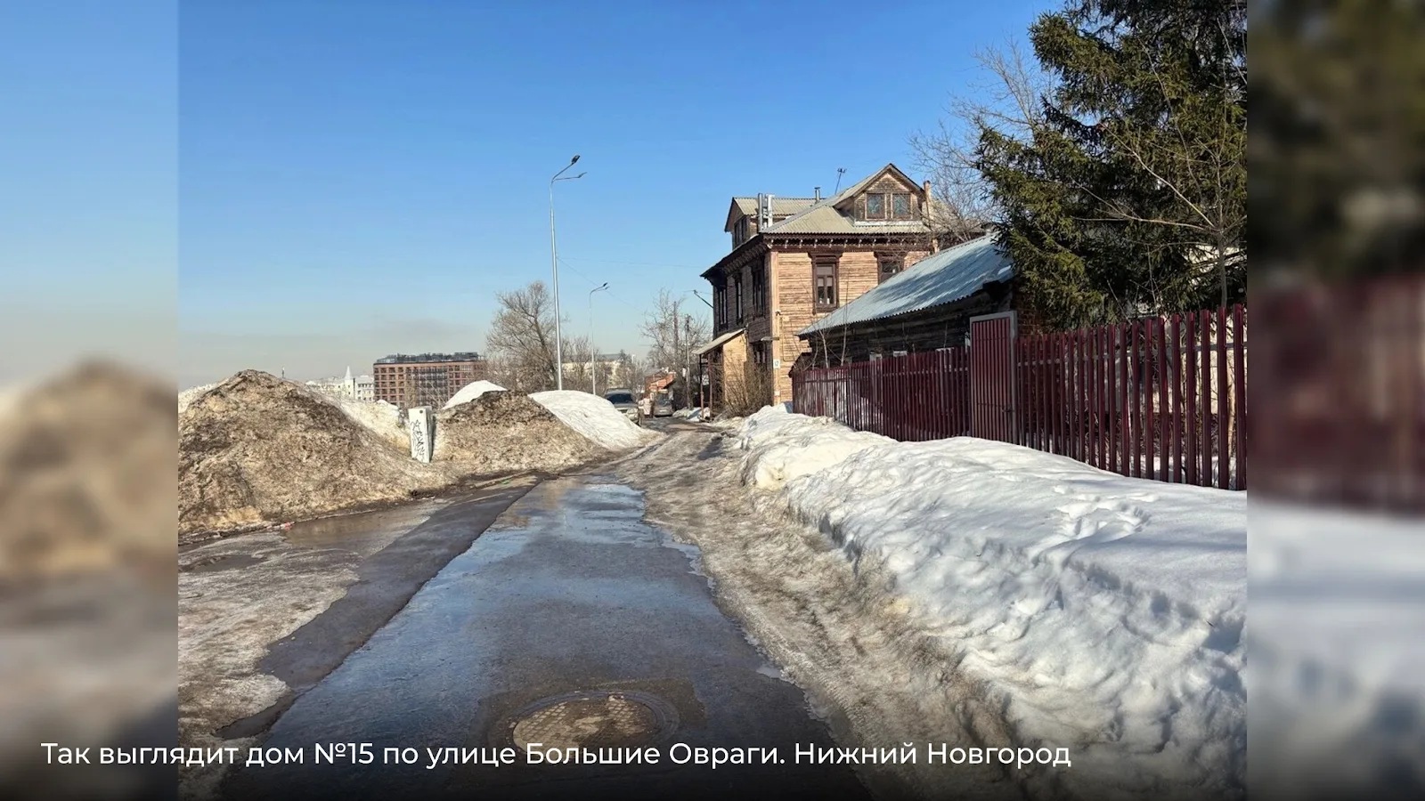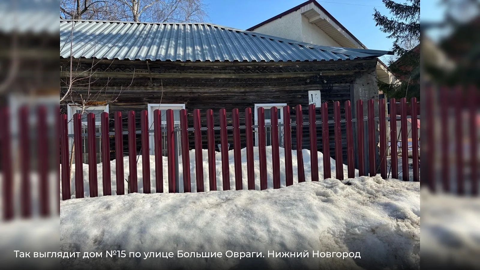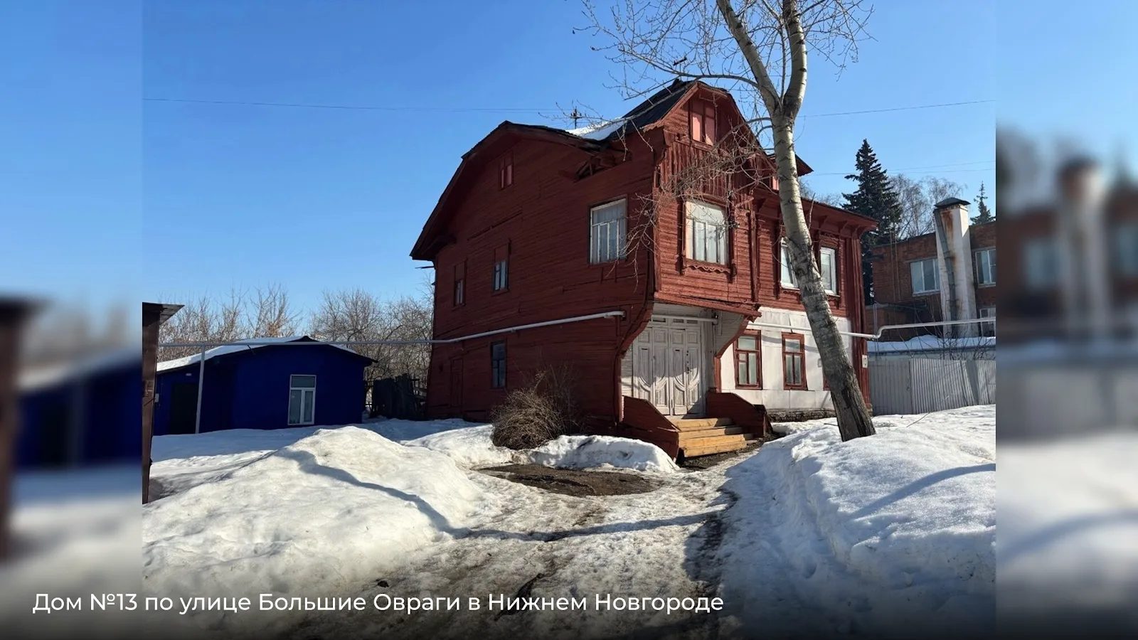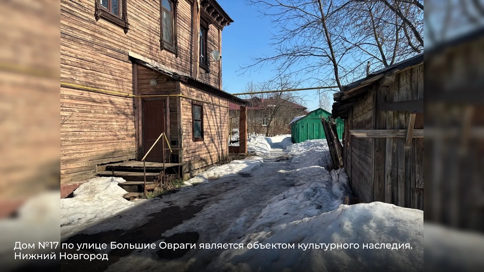 Дом №13 — деревянный, с подкрашенным, но изношенным фасадом. Щели в обшивке, деформированные доски — признаки длительного отсутствия капитального ремонта.