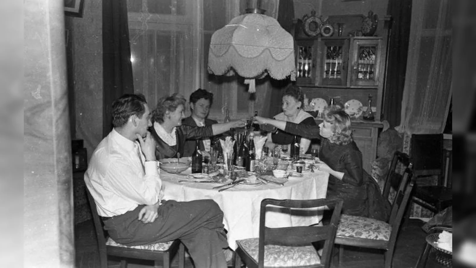 Застолье у актрисы Московского театра оперетты Ираиды Муштаковой выглядит почти как сцена из обычной жизни советской семьи. Буфет, стоящий в простенке, — одна из самых «ценных» вещей в комнате. Праздничная посуда аккуратно выставлена, как это было принято почти в каждом доме: отдельный набор «на праздники» и отдельный — на каждый день. Даже освещение — типичный элемент эпохи: абажур над столом, часто тканевый, с бахромой или декоративной отделкой. Такие детали создавали уют, но не были признаком богатства. И в этом интерьере снова нет ощущения элитарности. Скорее это аккуратная, культурная, но абсолютно «жилая» квартира, ничем принципиально не отличающаяся от множества других.