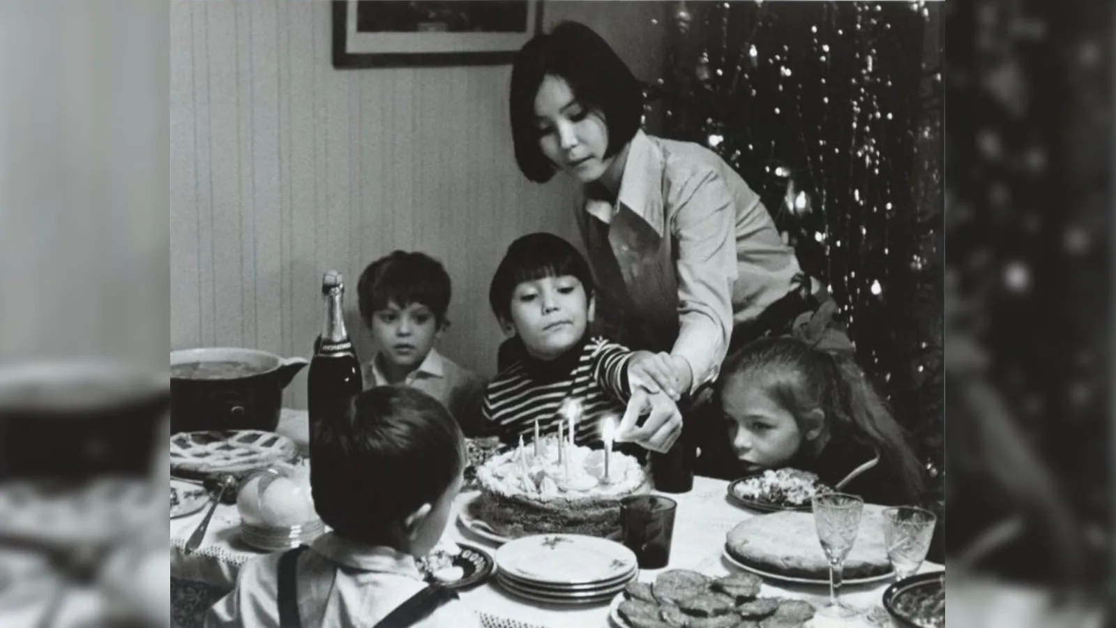На фотографии 1972 года — домашний праздник у Натальи Аринбасаровой, где присутствует Егор Кончаловский. Интерьер снова предельно узнаваем: елка в углу, репродукция картины на стене, праздничный стол с хрустальными фужерами и шампанским. Даже хрусталь в то время был дефицитом. Многие семьи получали такие вещи через знакомых или покупали с трудом. Поэтому каждый подобный предмет имел особую ценность и часто берегся годами. Но в целом обстановка остается очень «земной»: это квартира, а не декорация.