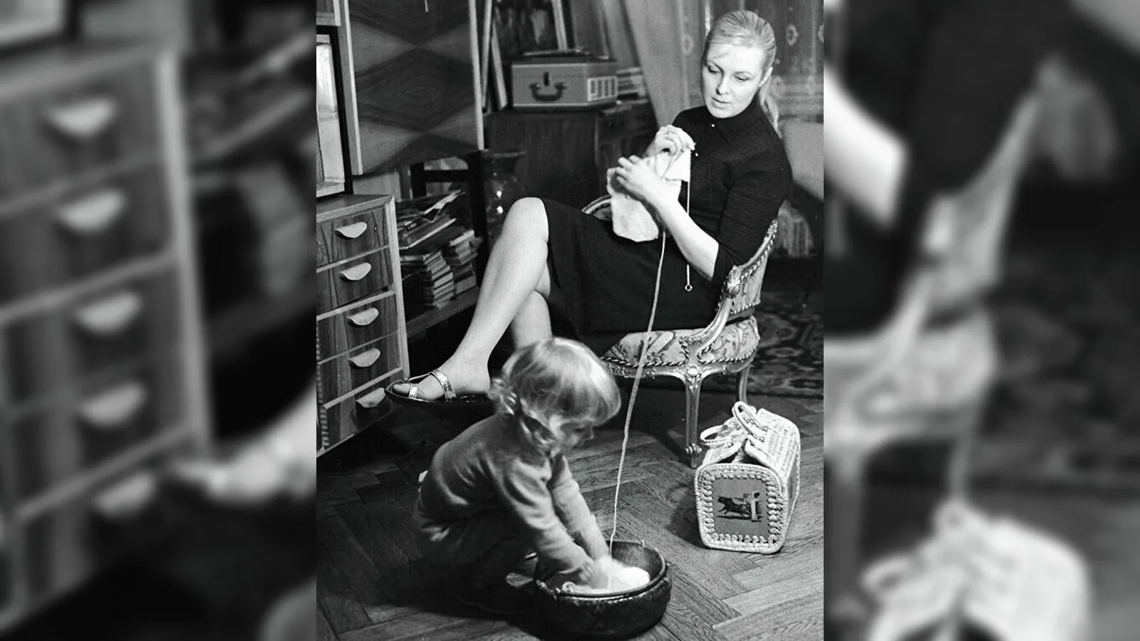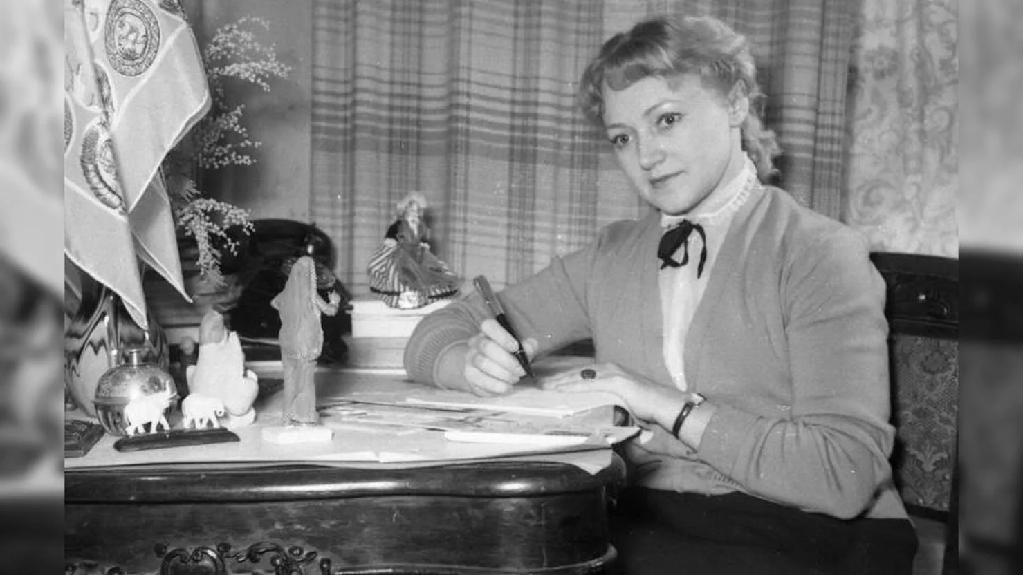 Совершенно другой пример — Людмила Касаткина, знаменитая «Укротительница тигров». На фото 1953 года она запечатлена у себя дома. Интерьер комнаты удивляет своей простотой. Никаких признаков роскошной жизни — обычная мебель, стандартный стол, телефон как единственный «элемент статуса». На полках — небольшие статуэтки, которые можно было встретить практически в каждом советском доме. Такие же мраморные слоники стояли на комодах у миллионов семей по всей стране. Даже цветные вазы или декоративное стекло были предметом не роскоши, а скорее удачного приобретения, иногда появлявшегося спустя годы. И здесь особенно ярко ощущается разница между современной медийной реальностью и прошлым: всенародная любовь не превратилась автоматически в роскошные интерьеры.