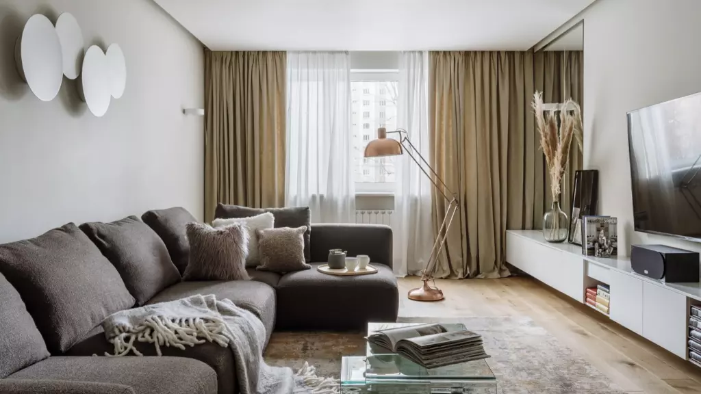 Вся квартира выдержана в светлых бежевых тонах с контрастными деталями: например, панели из чёрного стекла используются на кухонном фартуке и стене гостиной, визуально увеличивая пространство и придавая интерьеру современный вид.