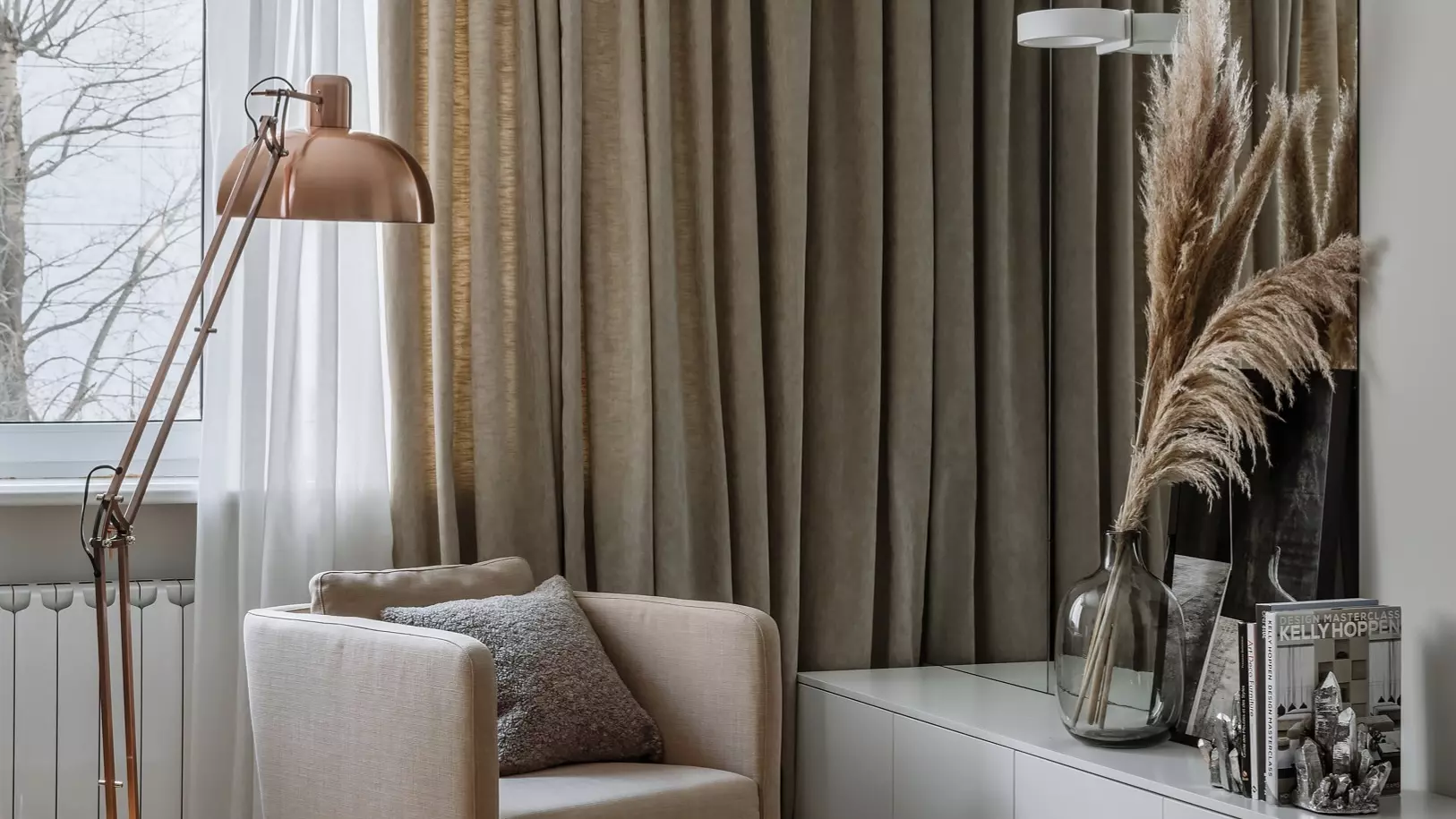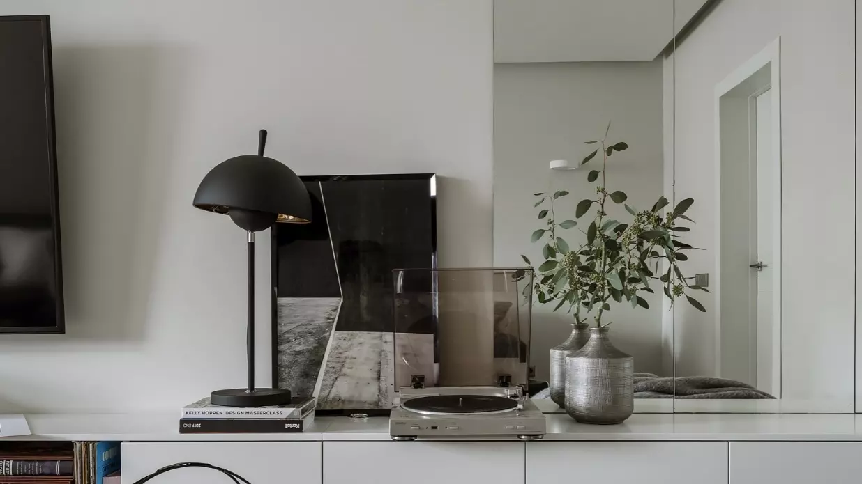 Для визуального расширения пространства и создания глубины дизайнер разместил зеркала по обе стороны от телевизора. Длинная консоль из МДФ изготовлена на заказ по индивидуальному эскизу, фасады — без ручек, что поддерживает минималистичную эстетику.