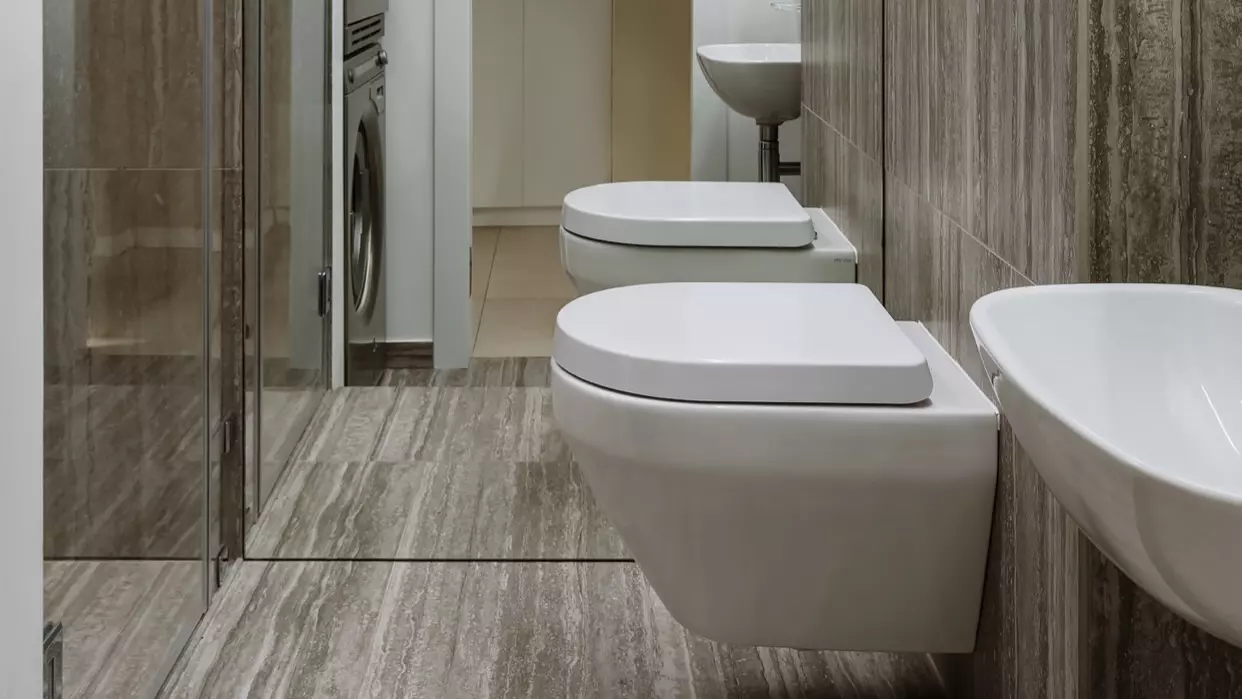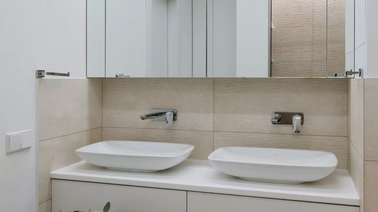 Санузлы оформлены в базовых и контрастных тонах, с рельефной плиткой, двойными раковинами и зеркалами для визуального увеличения пространства. В гостевом санузле установлена стиральная машина, а для семьи предусмотрено многофункциональное хранение.