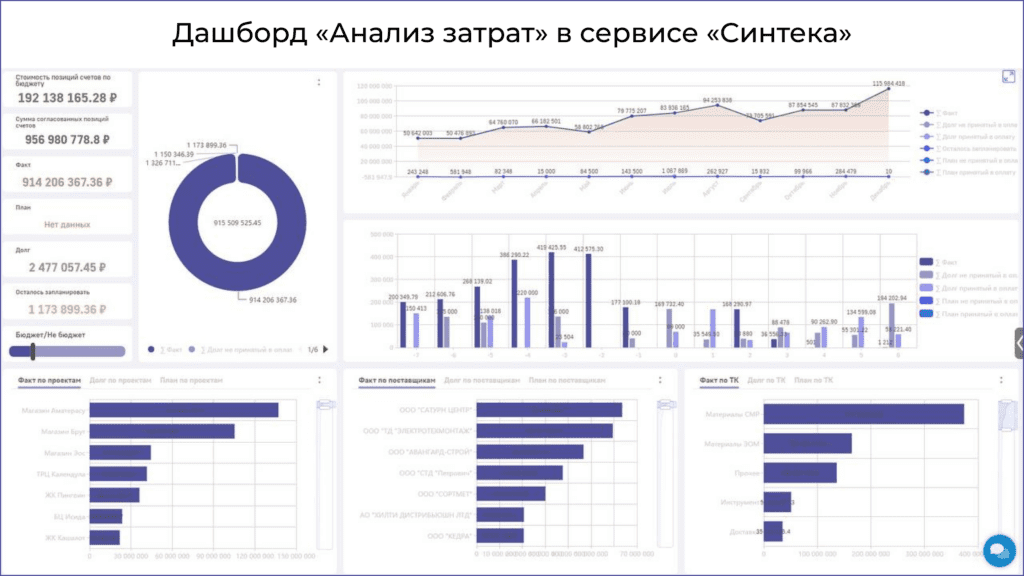 Сегодня в «Синтеке» доступны пять дашбордов: «KPI снабженца», который помогает оценить эффективность работы сотрудника отдела снабжения, «Анализ затрат» – покажет план/факт по тратам и долг по месяцам, а также в разрезе проектов, поставщиков и товарных категорий, «Анализ превышений», где отобразится, в каких бюджетах, заявках и счетах возникли превышения по количеству и сумме.