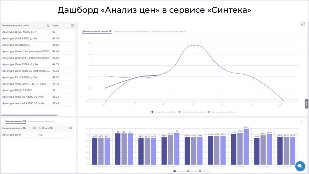 Еще есть дашборд «Анализ доставок», позволяющий наглядно увидеть, кто именно задерживает поставку и на сколько дней, количество оборудования или материалов, которое не доехало до объекта. Еще один дашборд – «Анализ цен» – позволяет оценить и спланировать закупки на основании цен из товарной базы, бюджета или заявок, а также увидеть и учесть динамику цен по месяцам и по поставщикам: