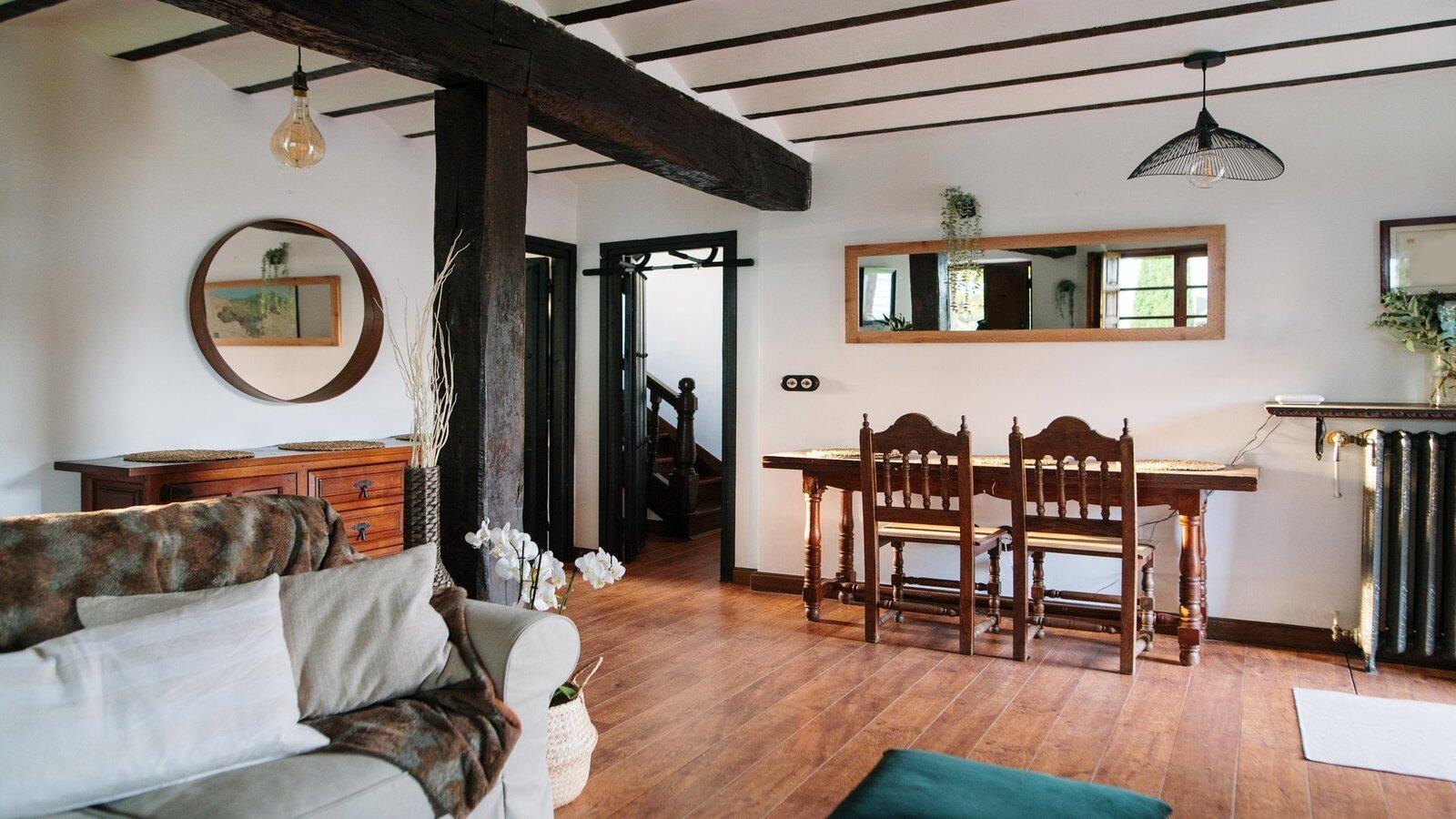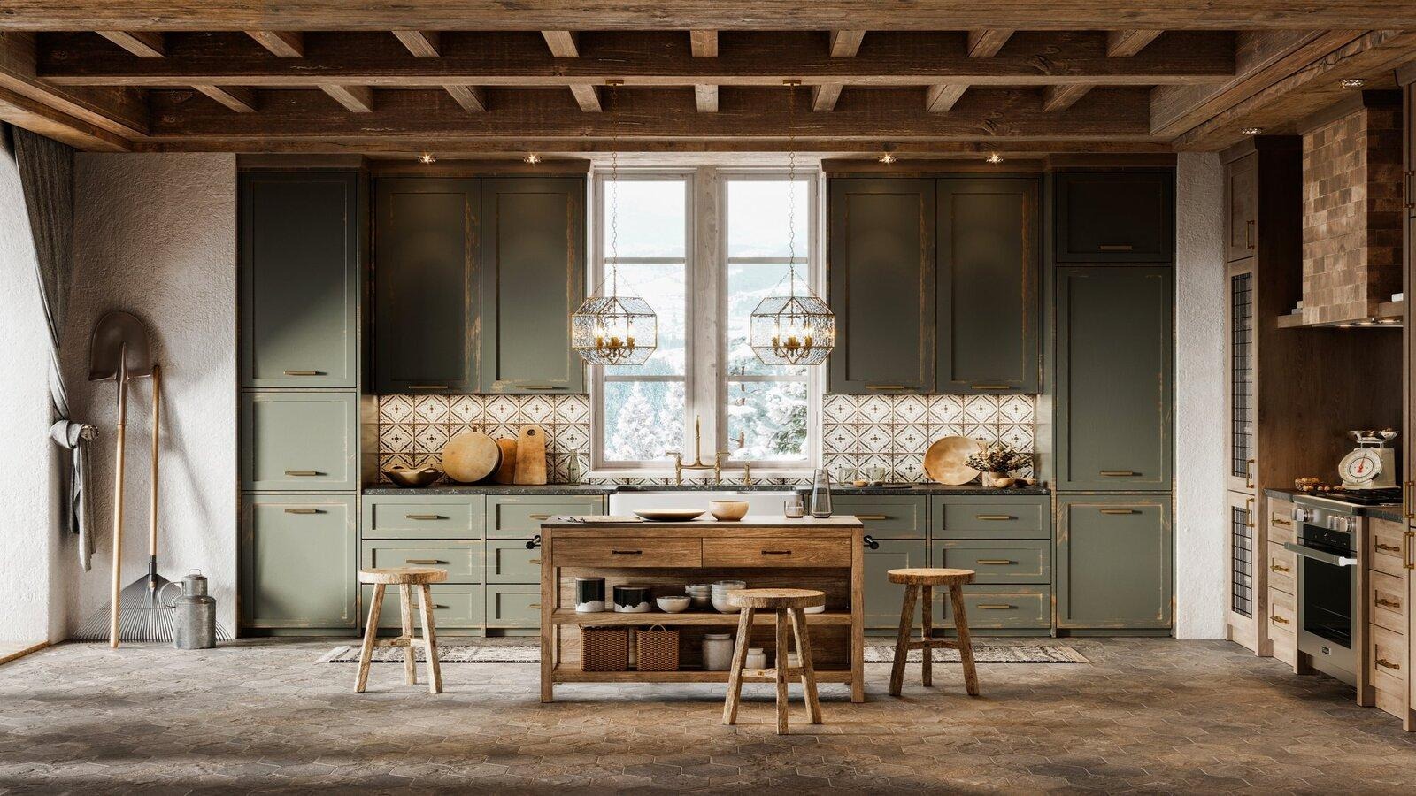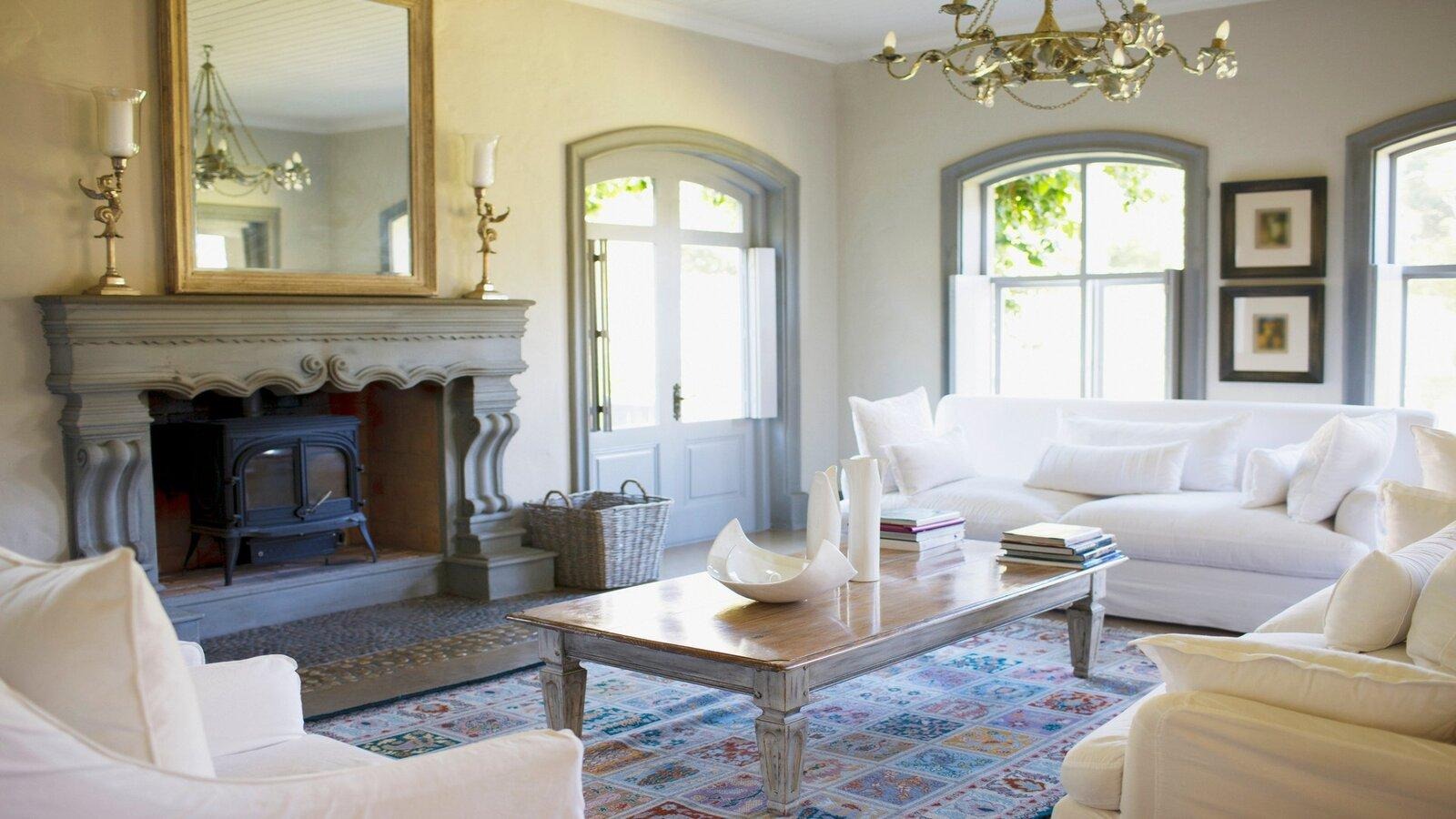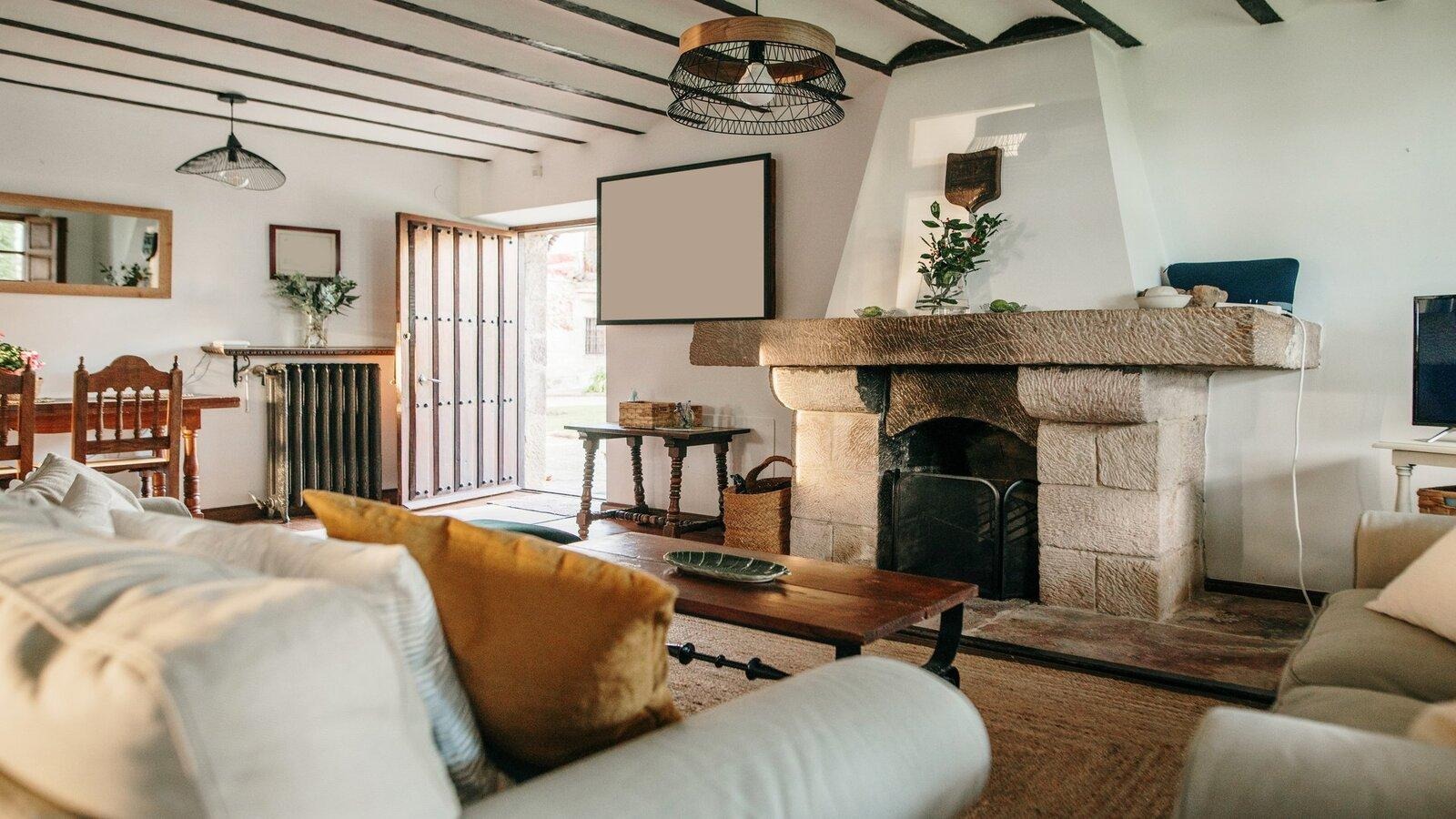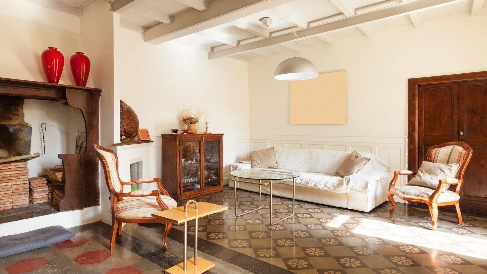Мебель массивная, основательная, часто украшенная резьбой или коваными деталями. В интерьере много предметов ручной работы: керамика, подсвечники, текстиль. Камин — частый элемент, создающий атмосферу уюта и домашнего тепла.