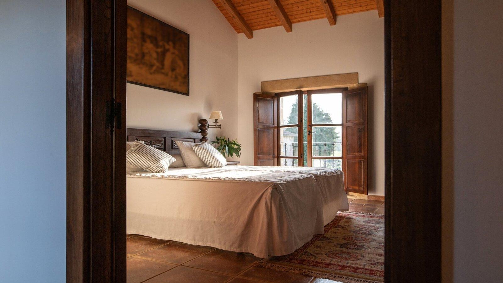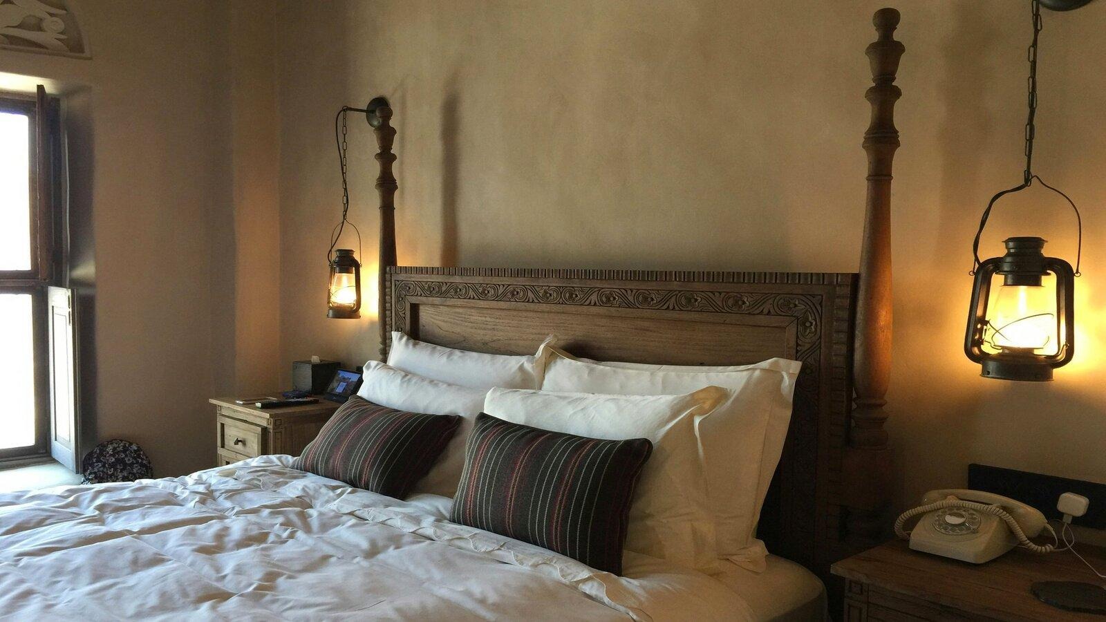 Спальня оформляется более мягко: массивная кровать, минимум мебели, много текстиля и спокойная палитра.