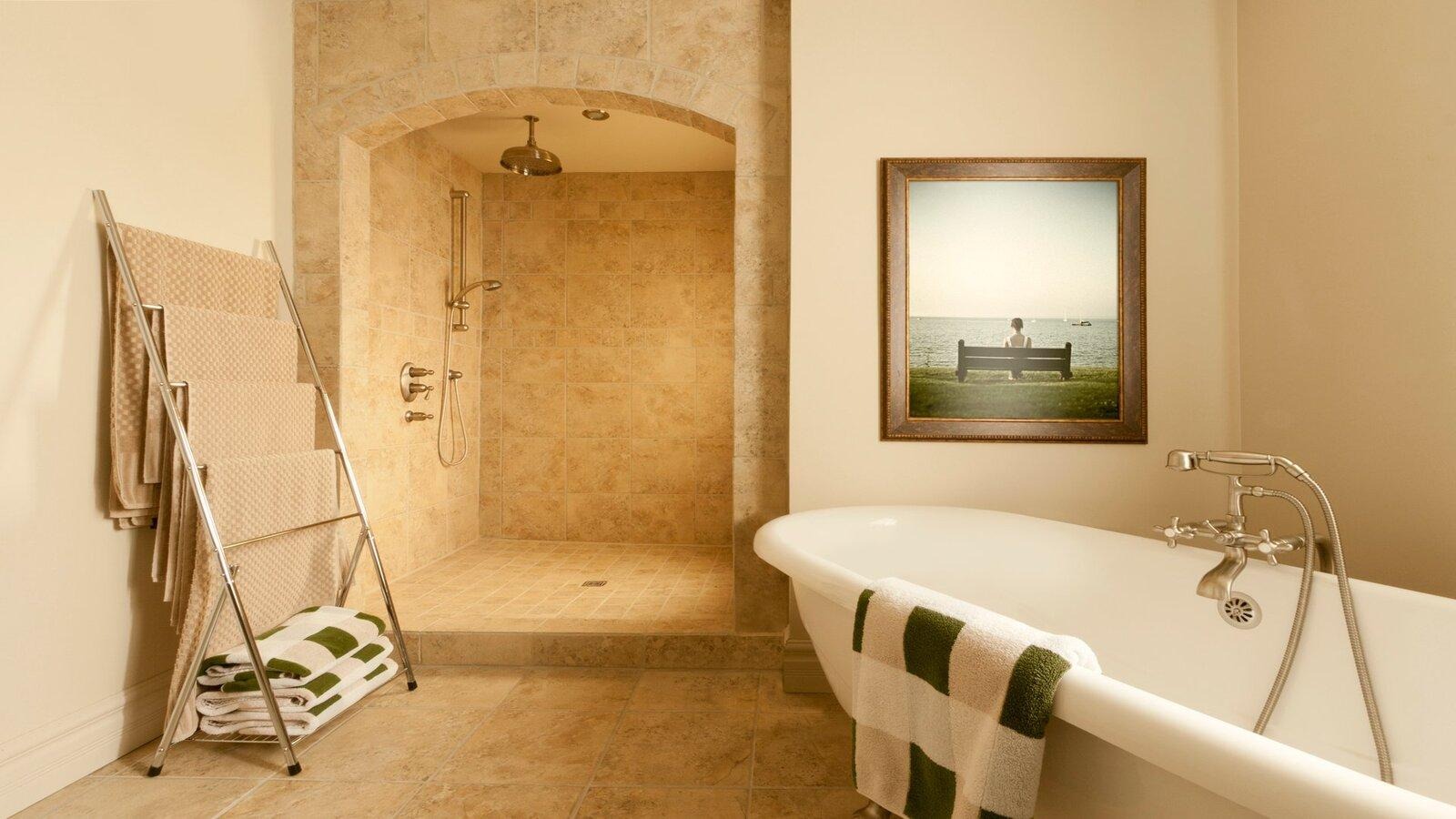 Традиционное решение — плитка, керамогранит или камень. Чтобы интерьер был комфортным в холодное время года, используют тёплые полы или добавляют ковры.