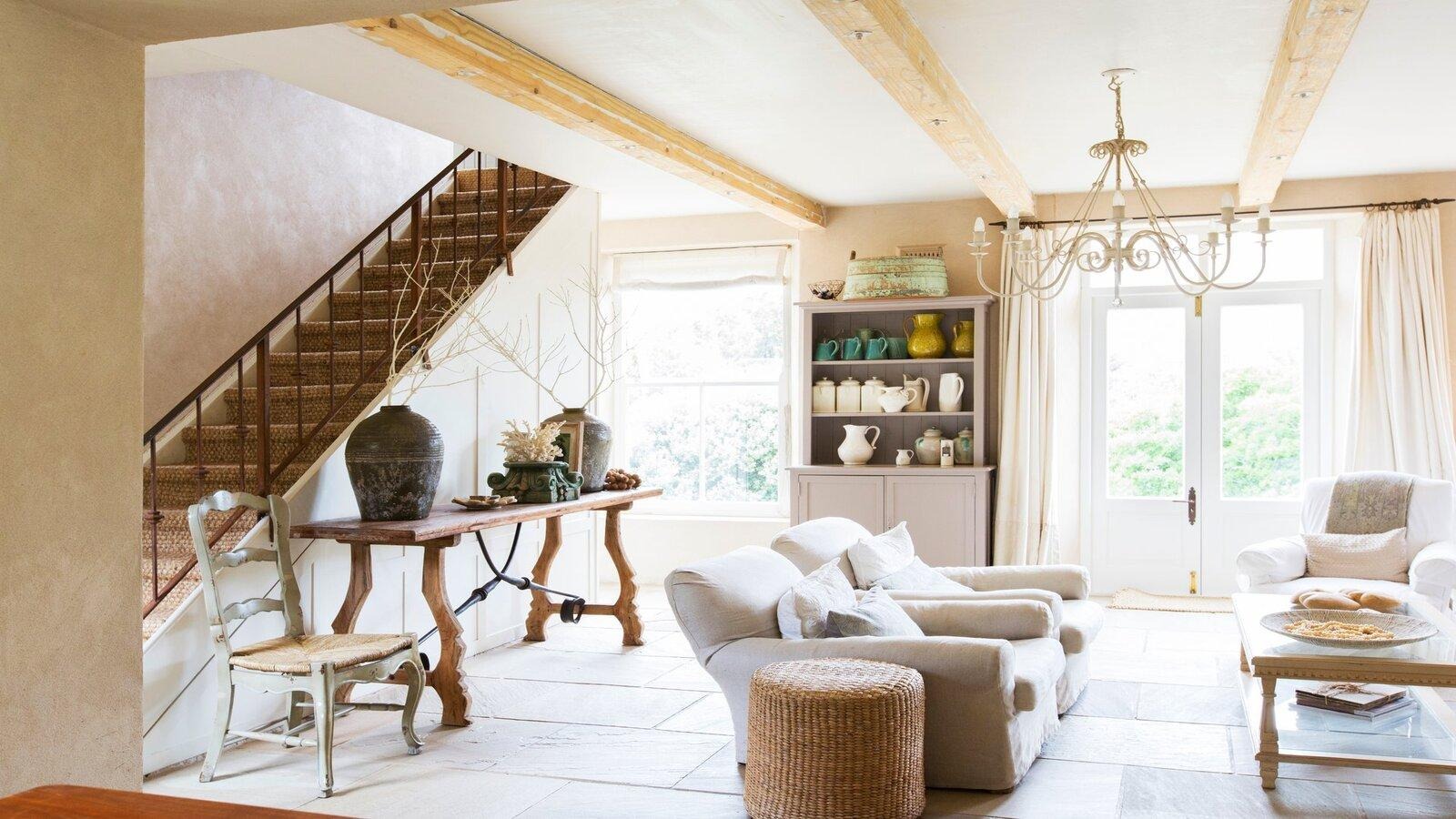 Потолки чаще всего белые, с открытыми или декоративными балками. Стены окрашивают или покрывают декоративной штукатуркой. Обои используются редко — стиль не предполагает гладкой, «глянцевой» поверхности.