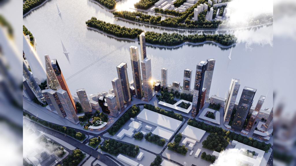 Вдоль береговой линии реки планируется возведение 16 жилых башен высотой от 90 до 200 метров, четырех башен апарт-отелей и одного 300-метрового офисного небоскреба. Первые этажи зданий и стилобаты будут заняты торговыми помещениями и объектами социальной инфраструктуры. В основании офисного небоскреба будет создан крупный транспортно-пересадочный узел с удобным доступом к остановкам общественного транспорта, службам такси, велодорожкам, паромному причалу и современной канатной дороге.