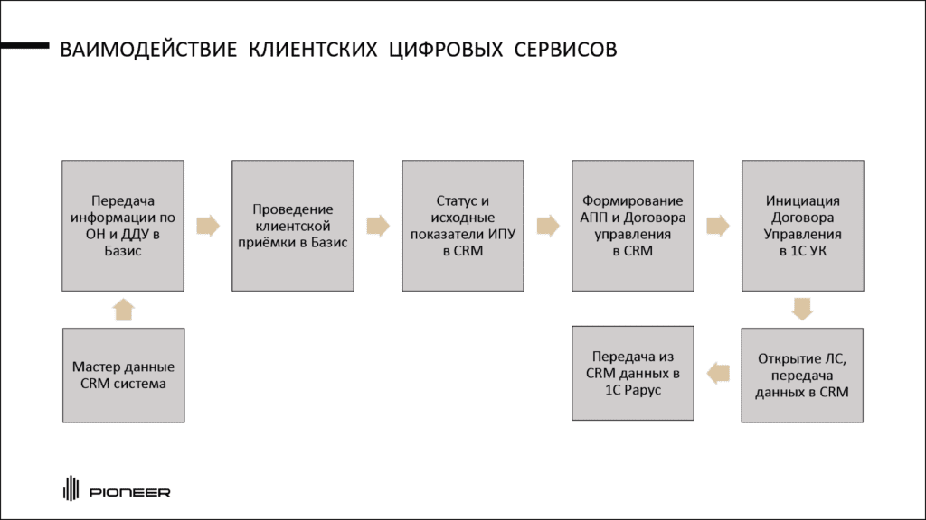 «Затем объект недвижимости и информация о ДДУ “падает” в “Базис”, далее проходит клиентская приемка. Из “Базиса” получаем данные обратно в CRM о статусе и автоматически достаем изначальные показатели по приборам учета, передаем в CRM. Из CRM инициируем договор управления в 1С УК. Открывается лицевой счет, данные возвращаются обратно в CRM и после этого уходят в 1С “Рарус”, где дальше ведем нашего жильца», – подробно объяснил Тимофей.
