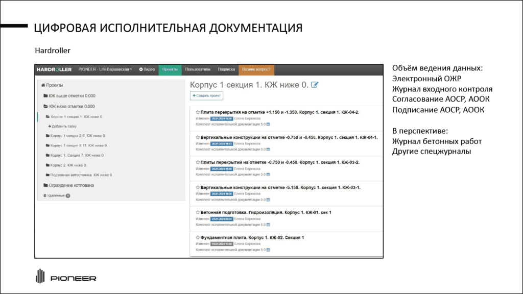 «В целом достаточно сложный процесс, с одной стороны. Потому что кажется, что исполнительная документация – это журналы, бумаги. Но бумаги очень много, и на стройплощадке все это перевести в цифру и договориться с подрядчиком о том, что он ведет в цифровом виде, сложно. Но в итоге все пошло, и сейчас идет глобально еще переход на полностью безбумажную стройку. На самом деле, часть застройщиков этот процесс прошла н-ное время назад, у нас такой вопрос не поднимался, но сейчас доходим до цифрового архива и передачи его в управляющую компанию с закрытием, подписанием всей документации в СОДе, которую получаем тоже в цифре», – рассказал спикер.