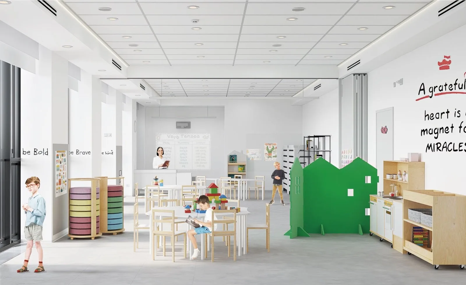 Современный частный детский сад предусмотрен и во дворе ЖК WOW, который «Страна Девелопмент» возводит на берегу Москвы-реки. Его оператором стал «Атенеум.kids», и, как отмечается на его сайте, уже идет набор детей в филиал на территории нового жилого комплекса. С точки зрения дизайна это будет стильное пространство для гармоничного развития детей.