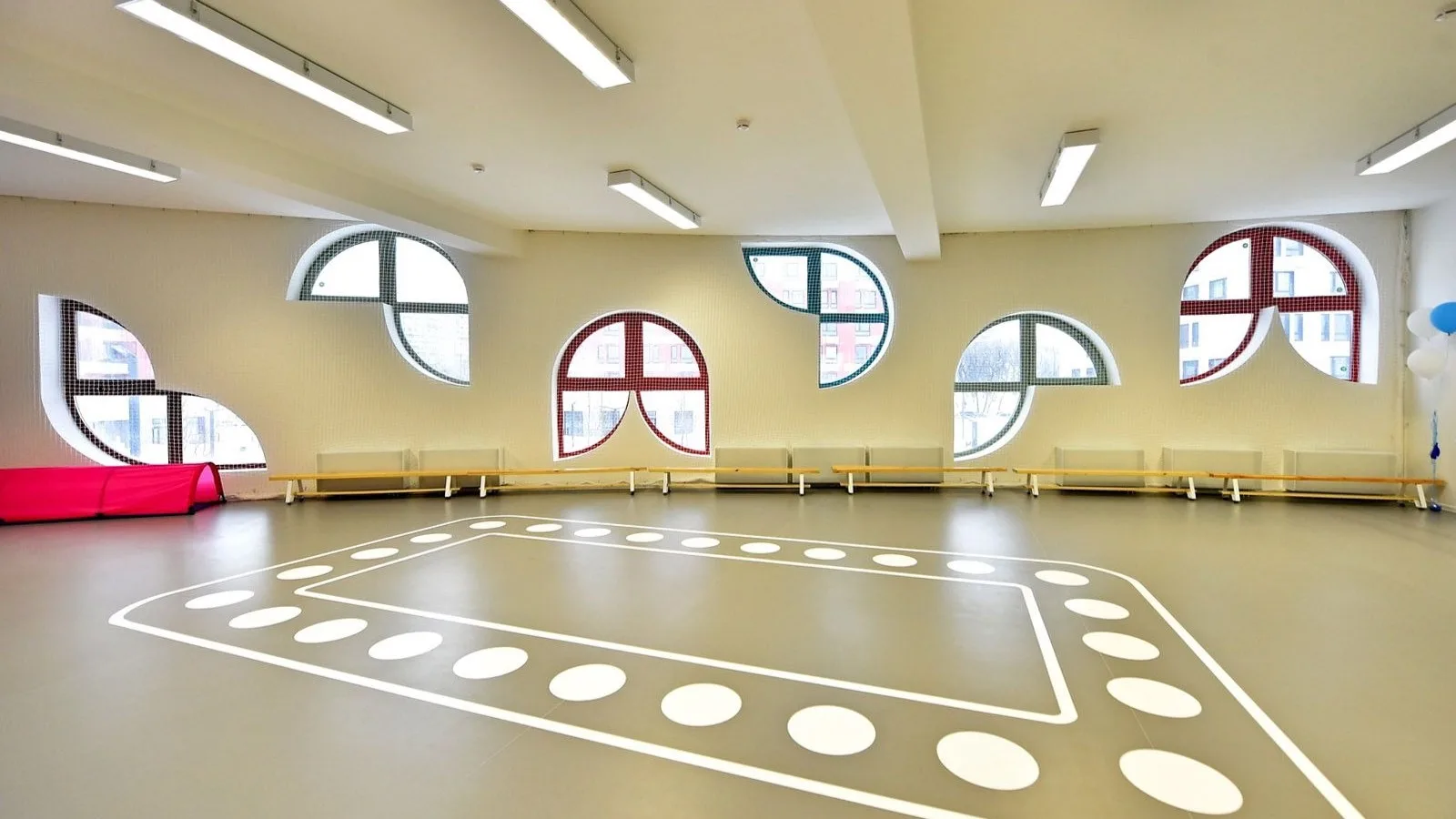 Необычное круглое здание с фигурными окнами-силуэтами и панорамным остеклением первого этажа разрушает стереотип «казенного» учреждения, стимулируя детское воображение с порога. Помещения внутри трансформируются: спальню от игровой отделяет раздвижная перегородка, если ее убрать и сдвинуть кровати, освободится дополнительное место для отдыха. Есть музыкальный, хореографический и физкультурный залы, творческая мастерская, учебный класс для уроков информатики, английского языка и игры в шахматы.