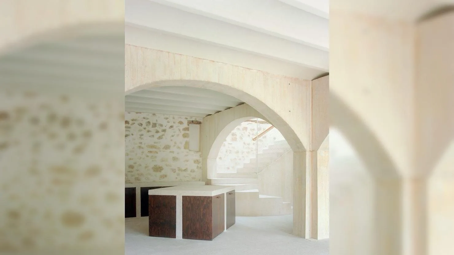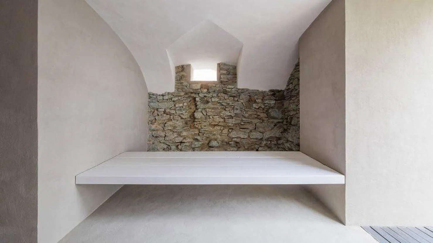 Новый «вставной» дом выполнен из светлого бетона и отличается строгой геометрией и чистыми линиями. Он не соприкасается напрямую со старинными стенами, благодаря чему сохраняется целостность оригинальной конструкции. Историческая кладка, своды и арки остаются полностью читаемыми и визуально доминирующими в пространстве. Современный объём, напротив, выглядит нейтральным и спокойным, не пытаясь конкурировать с архитектурой XVI века. Такой приём подчёркивает разницу эпох и делает диалог между ними честным и наглядным. Архитекторы сознательно отказались от стилизации и декоративных цитат, выбрав контраст как форму уважения к прошлому. Важную роль в проекте играет естественный свет, который проникает через существующие проёмы и мягко подчеркивает фактуру камня. Благодаря этому интерьер не теряет ощущения масштаба и исторической глубины.
