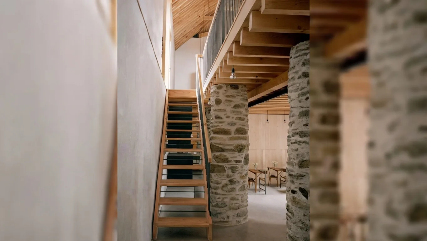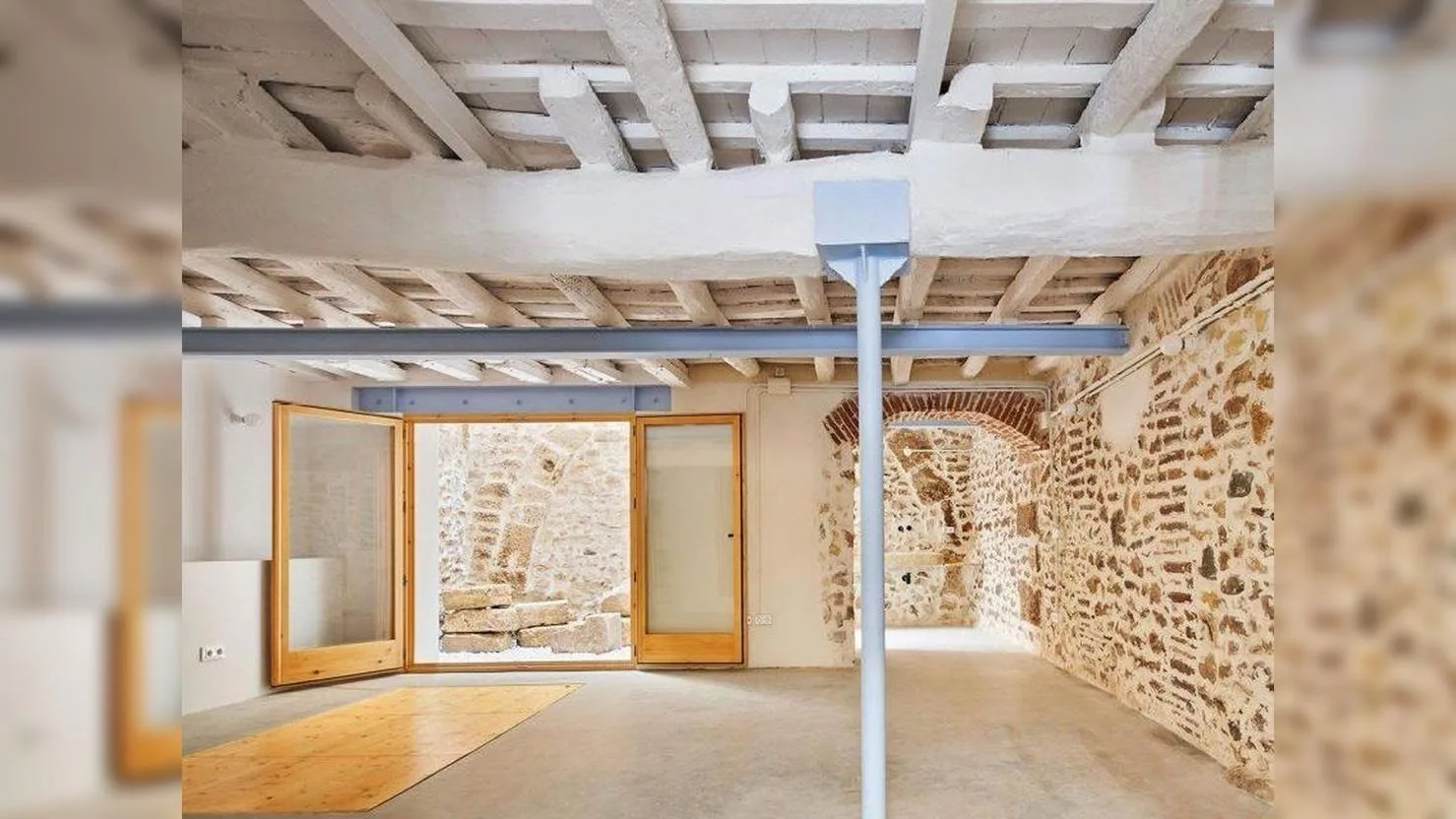 Проект Mediona 13 в Таррагоне, реализованный студией Nua Arquitectures, стал наглядным примером честного и открытого подхода к реконструкции исторической застройки. Архитекторы сознательно отказались от имитации прошлого, сделав ставку на ясное разделение эпох. Уже при первом взгляде на интерьер становится понятно, какие элементы относятся к первоначальной структуре дома, а какие были добавлены в XXI веке. Массивные каменные стены, сформированные столетиями, сохранены практически без изменений и выступают главным носителем памяти места. Их грубая фактура и неровная кладка подчёркивают возраст здания и его ремесленное происхождение. Старые деревянные балки перекрытий также были оставлены открытыми, со всеми следами времени, трещинами и потемнениями. Вместо маскировки дефектов архитекторы превратили их в часть визуального языка интерьера.