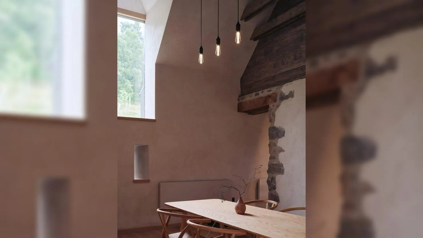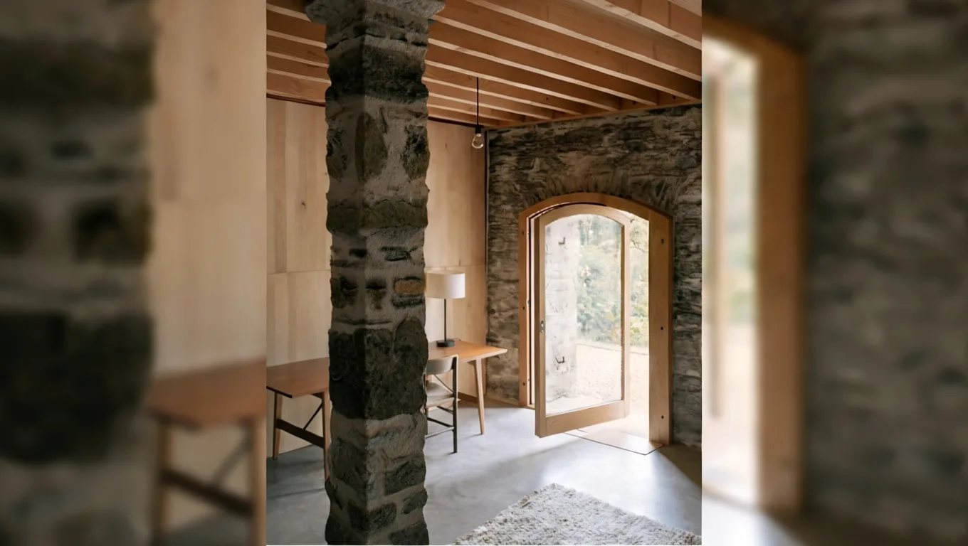 Для усиления конструкции использованы металлические балки и связи, которые намеренно не скрываются за отделкой. Холодный блеск стали резко контрастирует с тёплым деревом и пористым камнем. Этот контраст делает архитектурную историю дома «читаемой» без табличек и пояснений. Металл здесь не декоративен, а честно демонстрирует свою функциональную роль. Современные элементы интерьера выполнены лаконично и нейтрально, чтобы не спорить с исторической оболочкой. Белые поверхности и минималистичная мебель создают фон, на котором старые конструкции выглядят особенно выразительно. Свет играет ключевую роль в проекте, акцентируя рельеф стен и усиливая глубину пространства. Благодаря такому подходу дом не превращается в музей, оставаясь комфортным для жизни.
