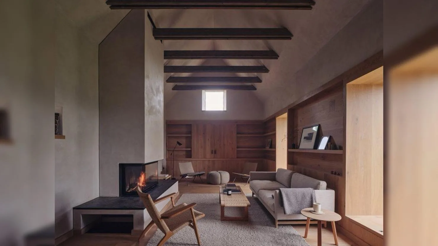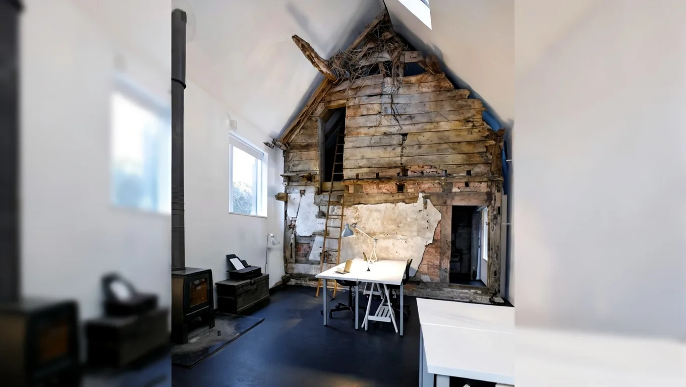 Новую кровлю возвели поверх старой, создав самостоятельную современную конструкцию. Исторические балки остались внутри дома, перестав быть несущими, но сохранив визуальное и символическое значение. Они работают как архитектурный «архив», открыто демонстрируя возраст здания. Такой приём позволил буквально оставить прошлое под крышей, не стирая следы времени. Новая конструкция выполнена с использованием современных инженерных решений, но без визуального давления на старую структуру. Контраст между аккуратной геометрией новой крыши и неровной фактурой старого дерева подчёркивает смену эпох. В интерьере это решение создаёт ощущение многослойности пространства. Дом воспринимается не как результат единовременного проекта, а как здание с длинной и сложной биографией.