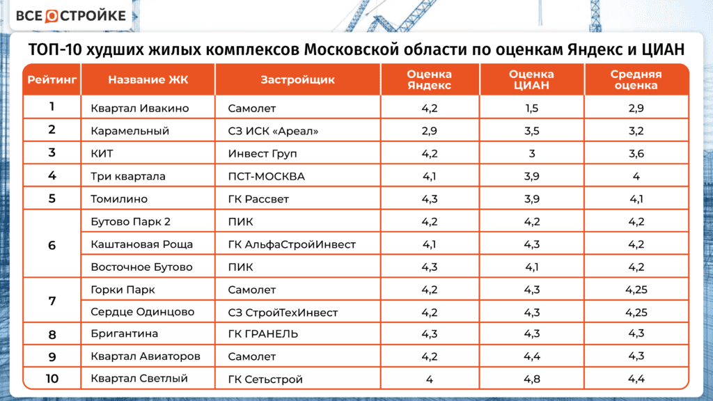 Топ-10 худших жилых комплексов Подмосковья по оценкам Яндекс и ЦИАН