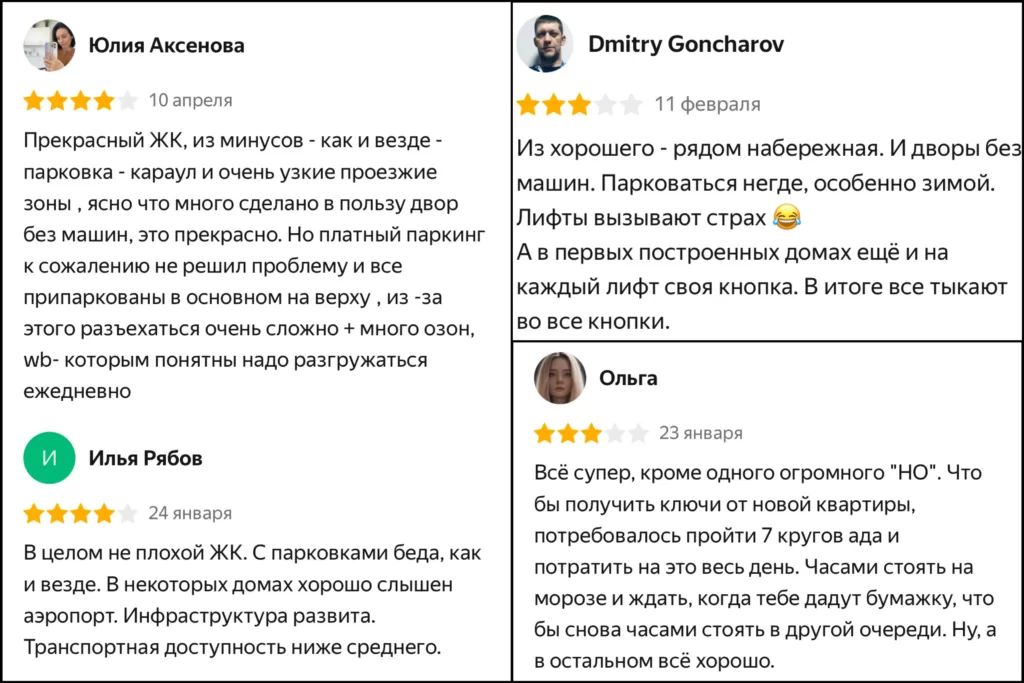 За основу мы брали отзывы с двух популярных платформ: Яндекс.Недвижимость и ЦИАН. Про 2GIS не забыли, но здесь сложнее найти вообще какие-либо отзывы и оценки – положительные или отрицательные, поэтому распределение мест в нашем списке происходило на основе среднего арифметического значения оценок от юзеров ЦИАНа и Яндекс.Недвижимости. Давайте перейдем непосредственно к оценкам ЖК.