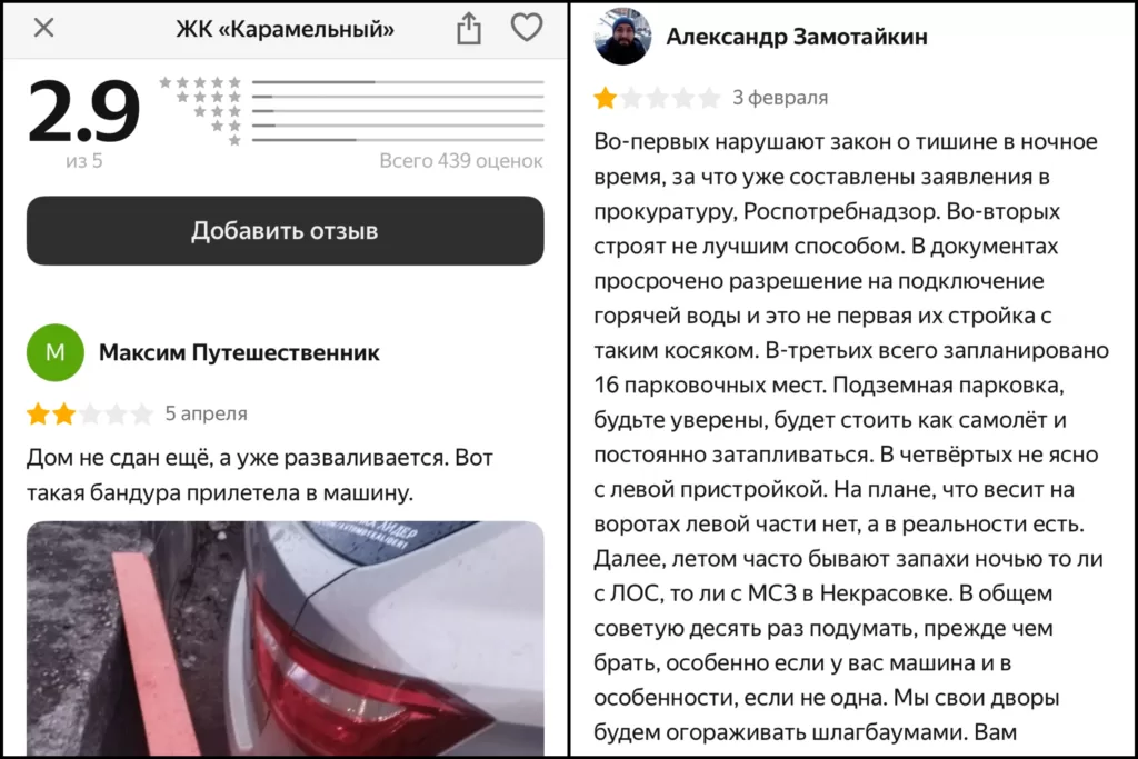 Недалеко сполз в таблице и ЖК «Карамельный» от застройщика ИСК «Ареал», набравший в среднем 3,2 балла. Но даже если рассматривать оценки двух платформ, то они все равно довольно низкие.