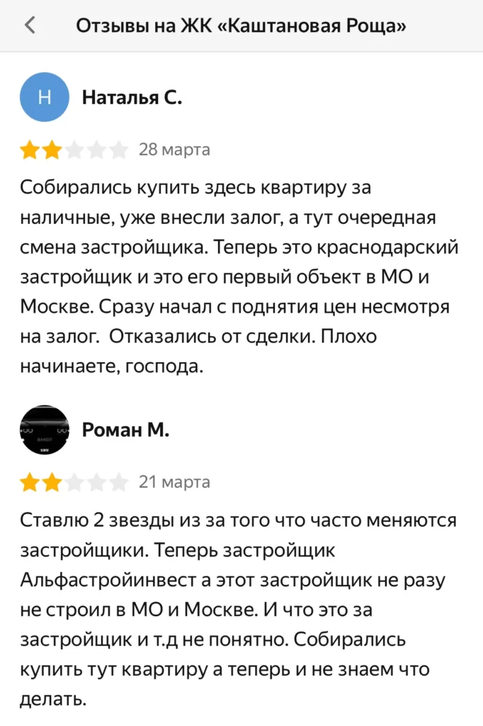 Если приглядеться, то можно увидеть, что в нашем антирейтинге сразу три ЖК оказались на 6 месте – и это не просто так, а потому что набрали одинаковые оценки (4,2 балла у каждого). «Бутово парк 2» (ПИК), «Восточное Бутово» (от того же застройщика) и «Каштановая Роща» (ГК «АльфаСтройИнвест»). К слову, в последнем потенциальных покупателей больше всего не устраивает частая смена застройщиков. И некоторые из-за этого не только пишут негативные отзывы, но и отказываются от сделки о покупке квартиры.