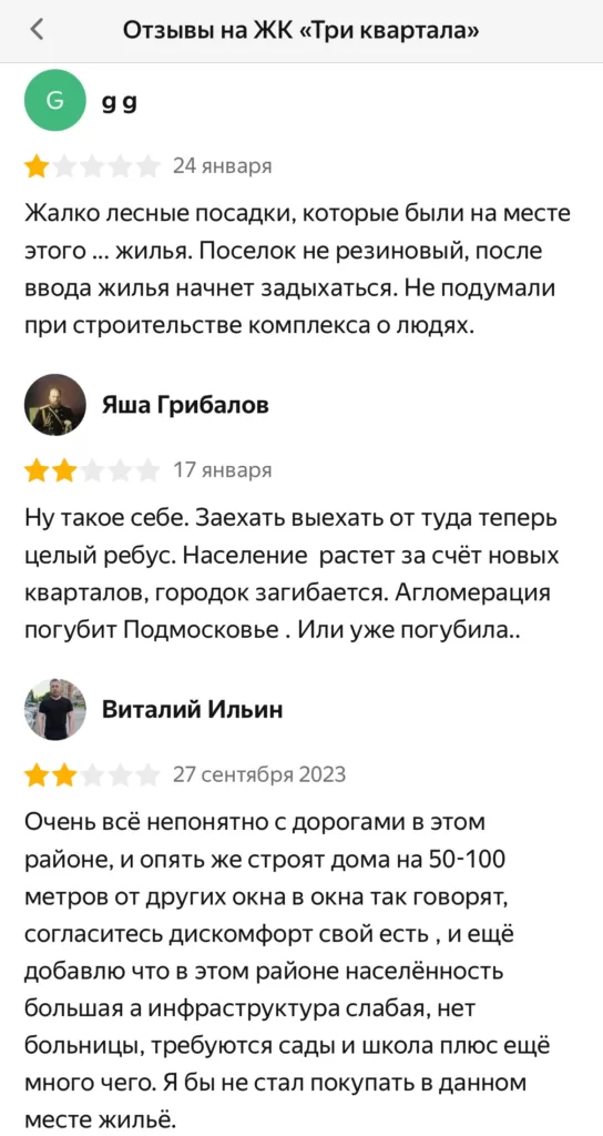 Среднюю оценку в 4 балла открыл жилой комплекс с говорящим названием «Три квартала» от ПСТ-Москва. Здесь комментарии людей говорят сами за себя.