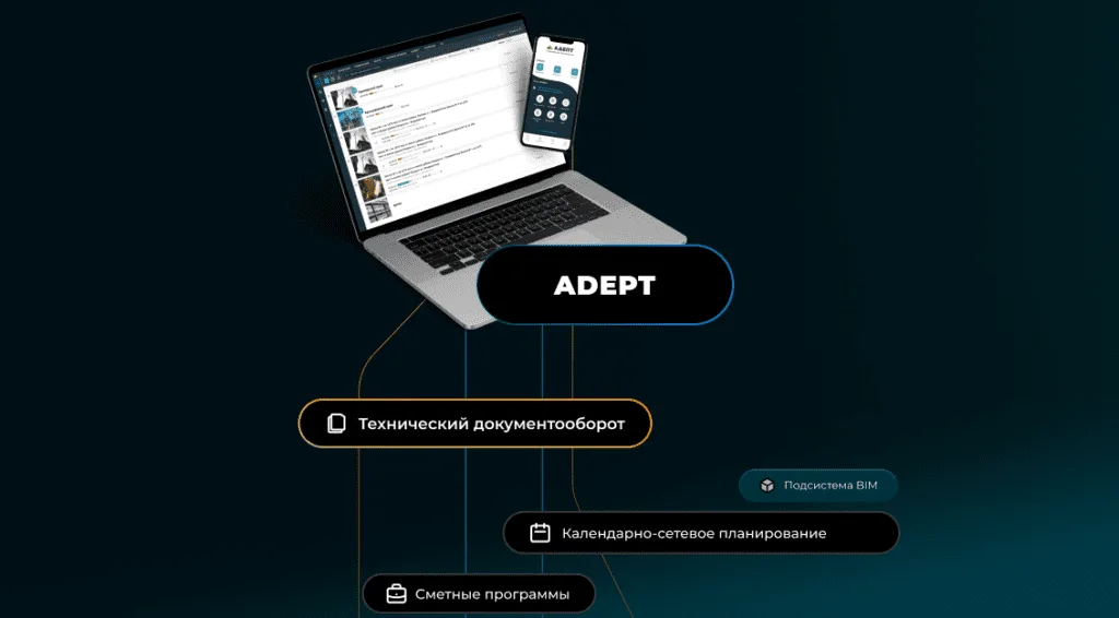 Адепт является ведущим разработчиком программного обеспечения в России для строительной отрасли, к тому же это единственная отечественная компания, которая может представить современные программные решения для полной цифровизации каждого этапа бизнес-процессов в строительстве.