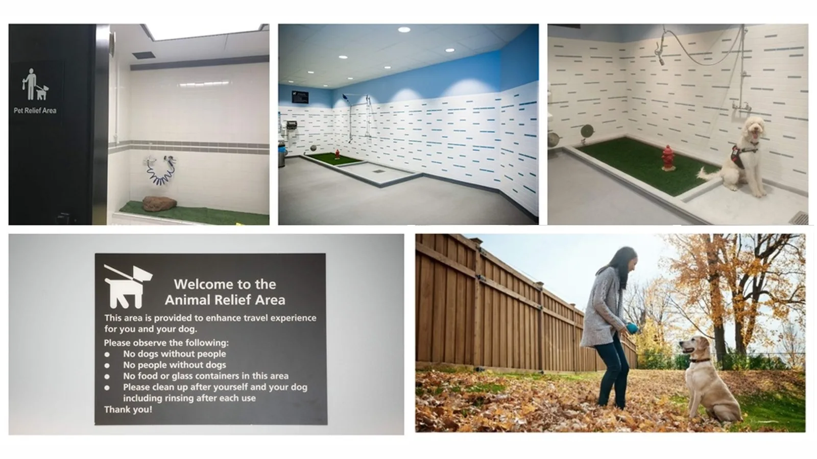 ORD предлагает несколько зон для выгула животных как внутри контрольной зоны, так и на внешних территориях. Они оснащены искусственной травой, мини-гидрантами, мешками для уборки и водой.