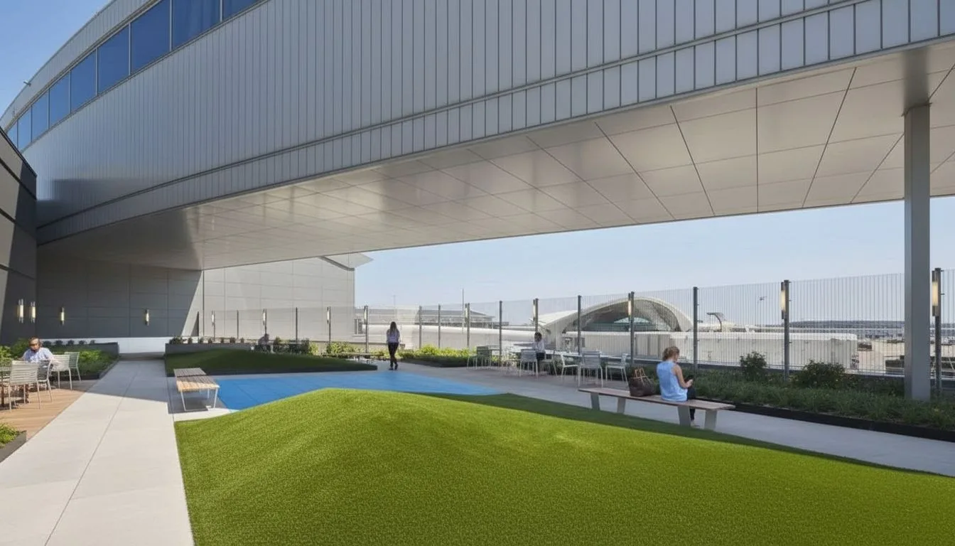 Орли предлагает специально оборудованные зоны между терминалами, напоминающие небольшие парки с песком и фонтанами для воды, доступные до контроля безопасности.