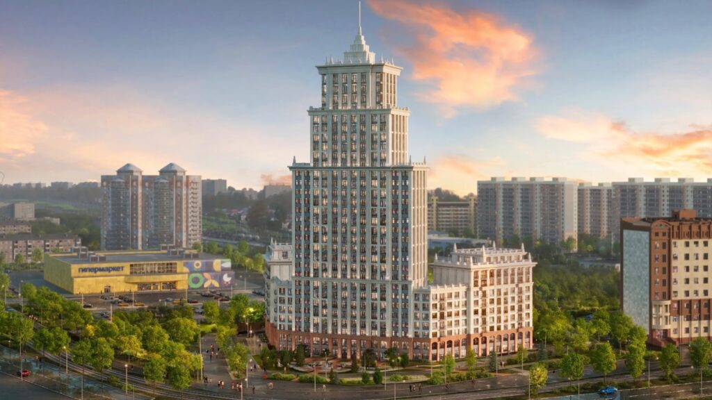 Архитектурный дом «Ломоносов» от SD Group — это жилой комплекс бизнес-класса в центре Томска на улице Красноармейской, включающий здания высотой 7, 10 и 30 этажей с 348 квартирами площадью от 28 до 118 кв.м и потолками высотой 2,7–3,3 метра. Комплекс уникален своим архитектурным решением, сочетая современность с элементами сталинского ампира, где высокий 116-метровый шпиль стал знаковым элементом городского силуэта. В комплексе предусмотрены подземный паркинг на 175 мест, торговая галерея, благоустроенный двор-парк с арт-объектом, спортивные и детские площадки, а также развитая инфраструктура рядом с домом. Сдача запланирована на третий квартал 2027 года.