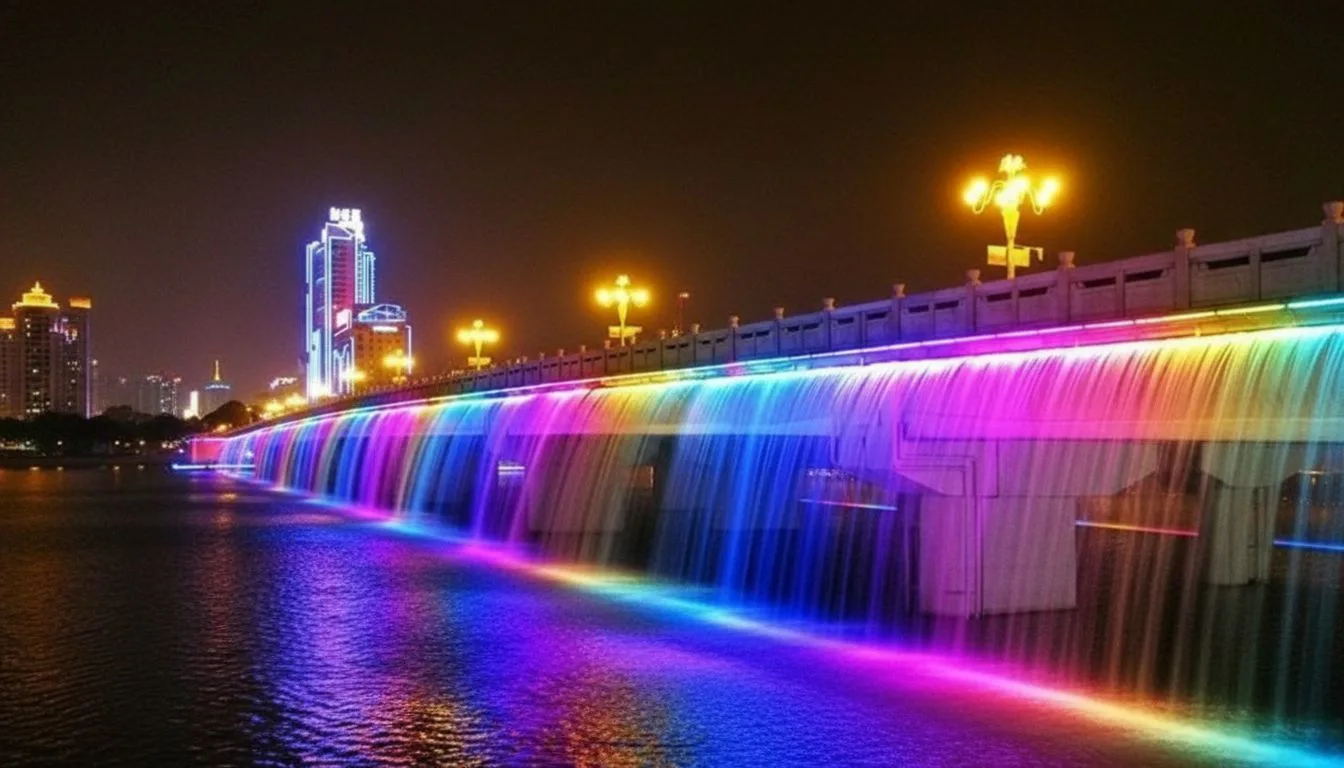 Радужный фонтан «Лунный свет», установленный на мосту в Сеуле, представляет собой двусторонний фонтан на мосту протяженностью 579 м. Учитывая обе стороны моста, общая протяженность фонтана составляет 1 140 м, на мосту установлено 380 специальных устройств, куда вода из реки поступает при помощи водных насосов и через которые снова выбрасывается в реку в виде фонтана с высоты примерно 20 м. Радужный фонтан, в котором в минуту выбрасывается 190 тонн воды с обеих сторон, днем представляет собой словно развивающиеся ветки и листья ивы, а также около ста других разнообразных образов. Ночью он превращается в яркий цветной фонтан, окрашенный в цвета радуги, каждый из которых имеет свою символику. С инженерной точки зрения это сложный объект, объединяющий транспортную функцию и водную инфраструктуру без ущерба для безопасности.