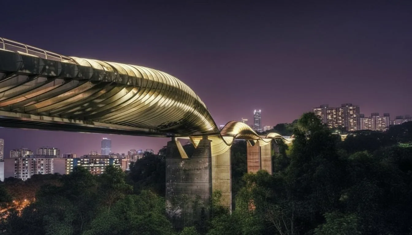 Сингапурский мост «Волны Хендерсона» был разработан архитектурным бюро «RSP» совместно с инженерами холдинга «PTE Itd». Величественное сооружение длиной в двести семьдесят четыре метра соединяет между собой Парк горы Фабер и Телок Бланга Хилл-Парк. Этот мост отличается волнообразной формой, которая интуитивно замедляет движение пешеходов. Он проектировался как часть парковой системы и служит не только переходом, но и местом отдыха. Здесь архитектура напрямую влияет на поведение человека в пространстве. Основу конструкции составляют семь стальных волнообразных рёбер, то возвышающихся, то уходящих за пределы главного настила. Внутри «волн» находятся ниши, служащие укрытием от непогоды и оборудованные креслами и скамейками для отдыха. С моста открываются живописные виды на парк, гавань и город. Сингапурский мост декорирован жёлтыми планками из дерева Балау.