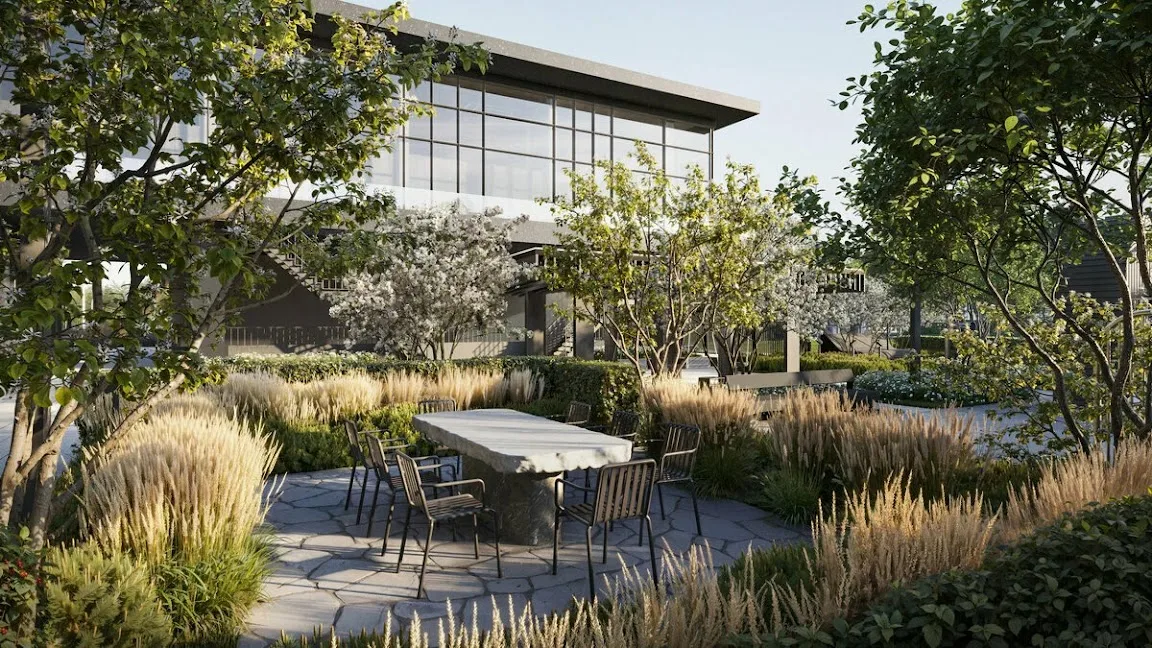 Романтическая атмосфера «Дома Горизонтов» создается благодаря продуманным общественным пространствам: ландшафтный сад перед домом и закрытый внутренний двор с зелеными лаунж-зонами, шезлонгами и столиками становятся идеальными декорациями для свиданий и уединенного общения, не требующего выхода за пределы дома.