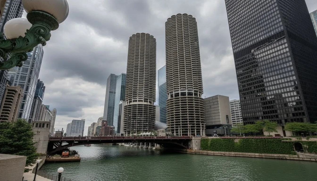 Марина-Сити — многофункциональный жилой и коммерческий комплекс зданий в Чикаго. Он был спроектирован в 1959 году архитектором Бертраном Голдбергом и построен в период с 1961 по 1968 годы за 36 миллионов долларов.Части комплекса были объявлены исторической достопримечательностью Чикаго в 2016 году. В медиа неоднократно отмечалось сходство башен-небоскрёбов и кукурузы. Также среди горожан башни именуются иногда гусеницами. Комплекс состоит из двух 587-футовых (179 м) 65-этажных башен с апартаментами и пентхаусами, открытыми в 1963 году. Он также включает в себя 10-этажное офисное здание (теперь отель), открытое в 1964 году, и конференц-зал, изначально использовавшийся как кинотеатр. Четыре здания, подъездные пути и небольшая площадь, которая изначально включала ледовый каток, построены на возвышении рядом с рекой Чикаго. Под платформой, на уровне реки, находится небольшая пристань для прогулочных судов, что и дало название сооружениям. Первые 19 этажей здания Марина-Сити занимает парковка, имеющая уникальный для середины 60-х дизайн — она закручена по спирали. На 20-ом этаже расположены прачечная, спортивный зал, складские помещения, комнаты для конференций. Этажи с 21-го по 60-й отданы под квартиры, отличительной их особенностью является полное отсутствие прямых углов и граней — каждая квартира имеет форму сектора круга. Также в каждой комнате квартиры имеется панорамный балкон.