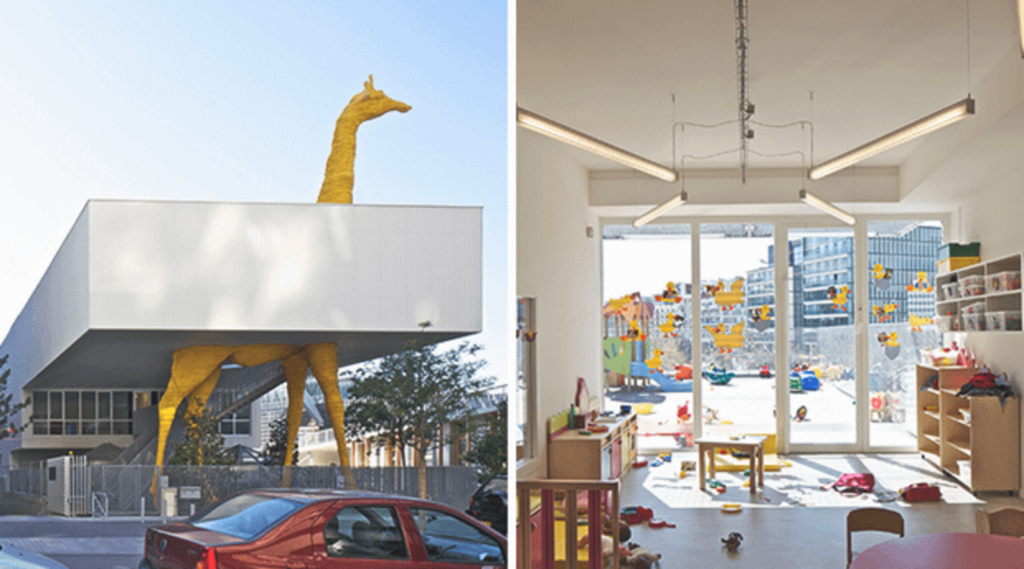 Как развить творческий потенциал детей в городской среде? Архитекторы в Париже предложили необычный ответ: детский центр, украшенный жирафом. Эта желто-красочная скульптура выполняет двойную функцию: практически поддерживая верхнюю часть здания и эстетически дополняя его, радует детей и всех прохожих.