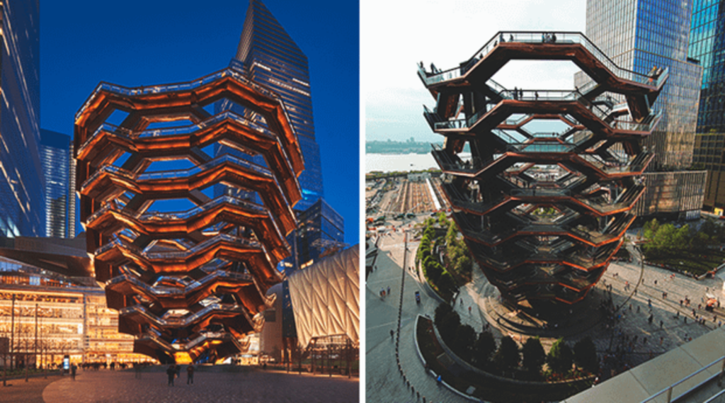 Одна из самых узнаваемых достопримечательностей Манхэттена — Vessel. Эта необычная конструкция, созданная Томасом Хезервиком, имеет 154 ступени винтовой лестницы и служит как смотровой площадкой, откуда открывается панорамный вид на город, так и общественным пространством. Она способна вместить до 1000 человек и доступна для людей с ограниченными возможностями благодаря лифтам и пандусам. Критики сравнивают Vessel с Эйфелевой башней, а некоторые СМИ описали ее как «лестницу в никуда». Сам архитектор вдохновлялся детскими воспоминаниями о винтовой лестнице на заброшенной стройплощадке.