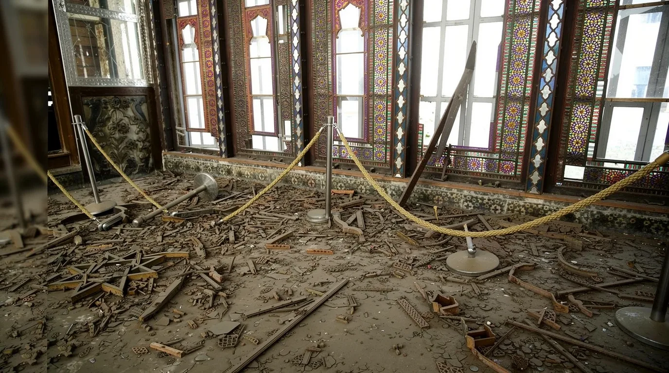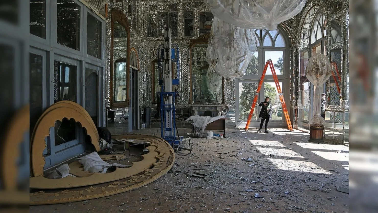 В результате ударов повреждения получили отдельные залы, в том числе знаменитый Зеркальный зал. Его декоративное оформление выполнено в технике айене-кари — сложнейшей системе мозаики из фрагментов зеркал, формирующих многослойные орнаменты. Эта техника требует высокой точности и практически не поддается полной реконструкции в случае разрушения. Взрывная волна также затронула исторические витражи, деревянные элементы и садовые ансамбли.