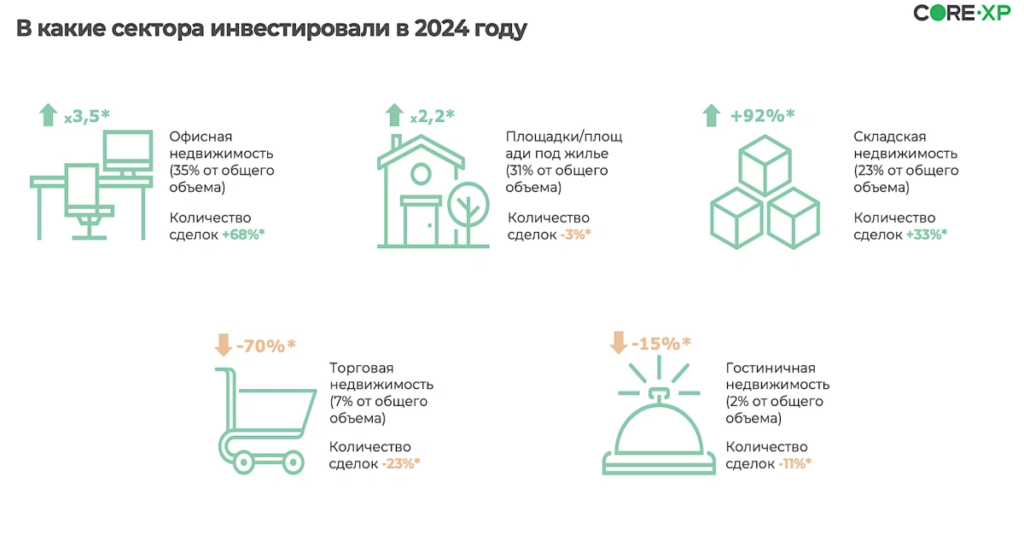 В 2025 году ожидается падение инвестиций в российскую недвижимость до 700-800 млрд руб. Это почти на 27-37% ниже прогнозируемого показателя 2024 года. Доля иностранных продавцов в общем объеме инвестиций в недвижимость в 2025 году останется на уровне 9-10%. Давление на инвесторов будет оказывать высокая ключевая ставка. Финансирование становится заградительно дорогим даже при ставке 17-18%, но также есть много недооцененных объектов, поэтому инвестиции в недвижимость будут происходить. Спрос также станет поддерживаться за счет конечных пользователей. Что касается сегментов, то здесь рост, как и в этом году, будет обеспечен за счет офисов и складов. В целом, успешная инвестиция в недвижимость требует тщательного анализа рынка, выбора объектов высокого качества с оптимальной планировкой и расположением в перспективном районе, а также готовности к долгосрочным вложениям. Ранее мы также писали про инвестиции в коммерческую недвижимость в новостройке, а еще о видах и преимуществах инвестиций в недвижимость.