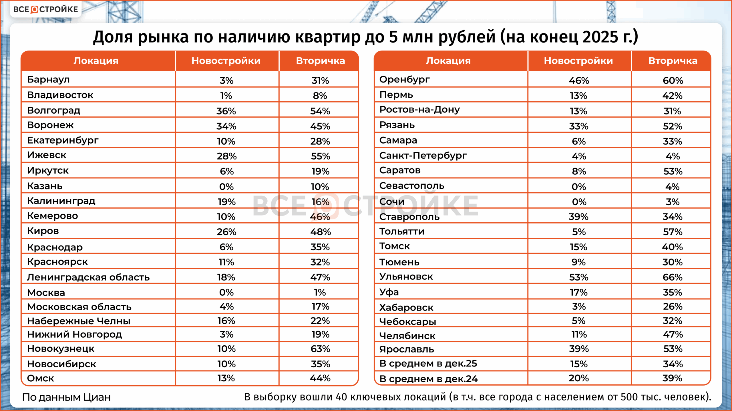 По данным «Циан», год назад в среднем по городам в бюджете до 5 млн рублей продавалось 20% квартир на первичном рынке и 39% на вторичном.