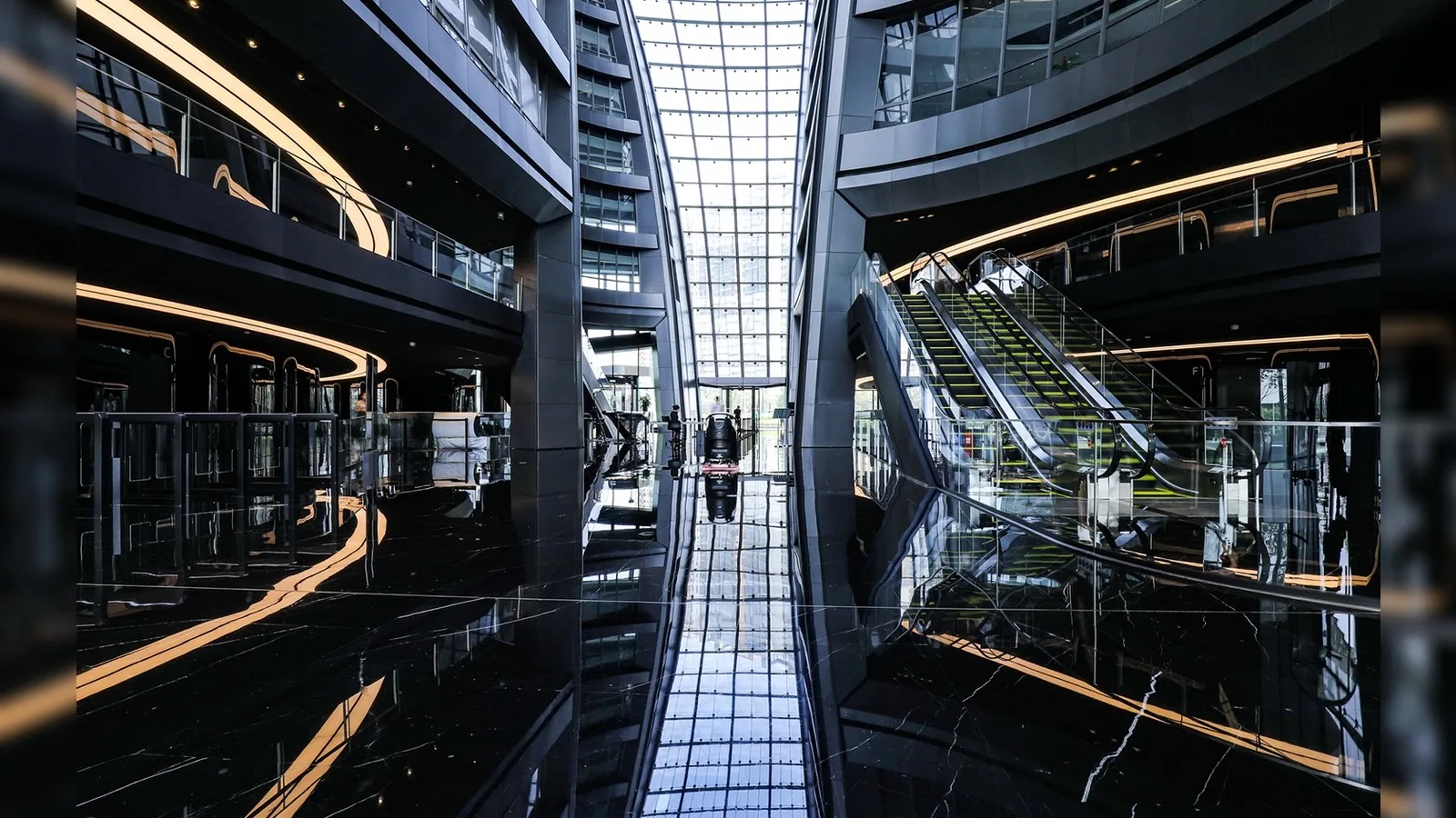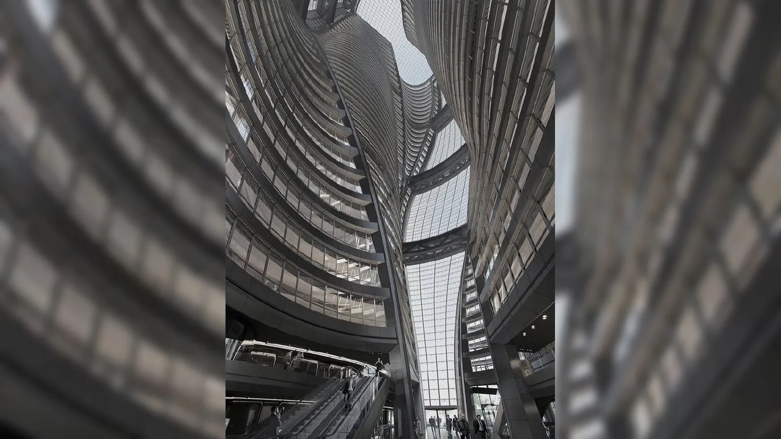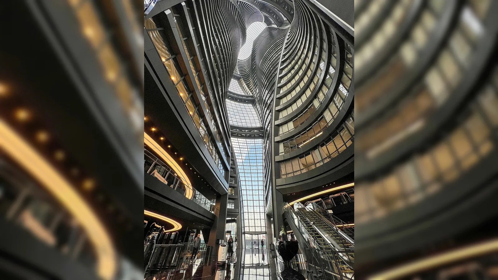 Между двумя башнями располагается гигантское внутреннее пространство — атриум, который не только выполняет композиционную роль, но и становится ключевым элементом инженерной логики здания. Его высота превышает 190 метров, что делает его самым высоким атриумом подобного типа в мире.