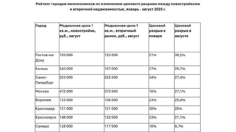 Наибольший рост разницы зафиксирован в Москве, с 10% до 27,1%, Уфе, с 34% до 48,7% и Ростове-на-Дону, с 21% до 30,2%.
