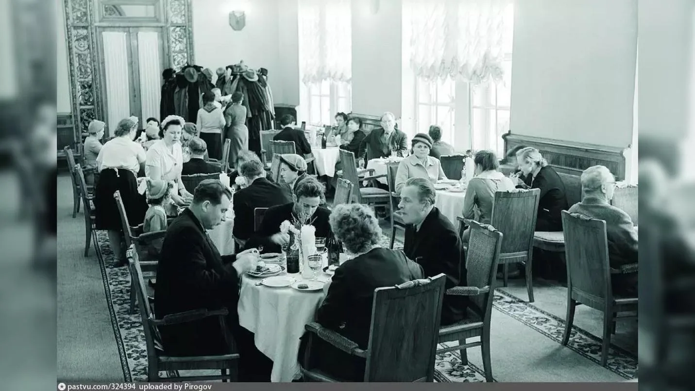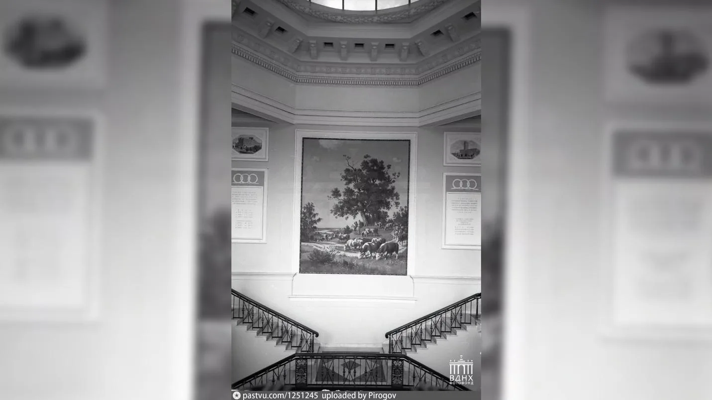 Одним из самых запоминающихся элементов старого павильона стал стеклянный ступенчатый купол. Это решение выглядело необычно даже на фоне других павильонов ВДНХ. На вершине размещался декоративный сноп, подчеркивающий сельскохозяйственную тематику. Но главным новаторством была организация пространства внутри. Центральный зал под куполом был круглым и включал декоративный фонтан. Вокруг него располагалась основная экспозиция. Боковые помещения использовались как торговые зоны, где посетители могли купить продукцию мясной промышленности. Фактически это был гибрид выставки и торгового пространства — редкое решение для своего времени. Более того, на крыше павильона работала закусочная с открытой террасой, куда можно было подняться по лестницам с двух сторон здания. Это превращало павильон в полноценное общественное пространство, а не просто выставочный объект.